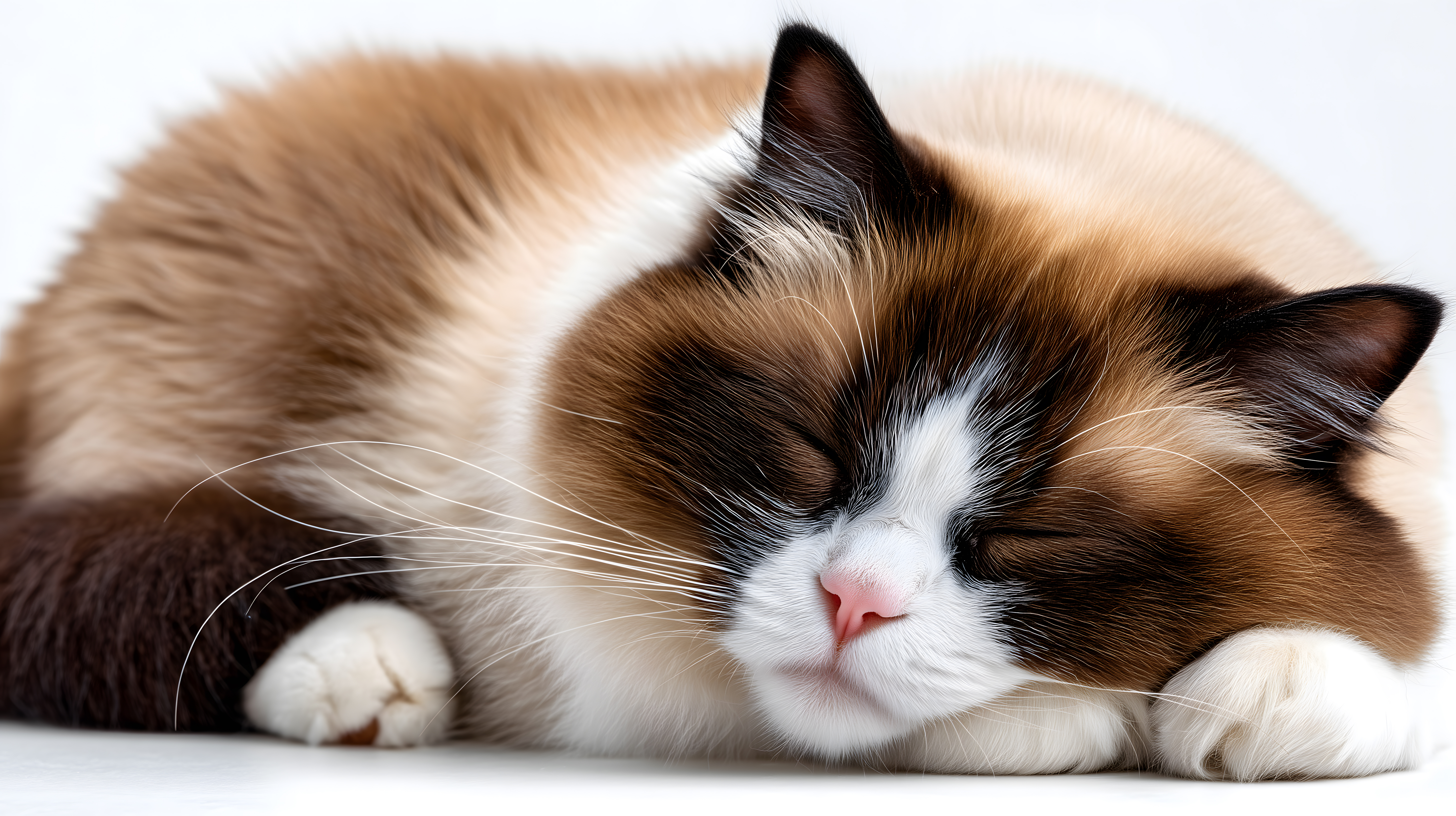 Das Bild zeigt eine gemütlich zusammengerollte Ragdoll-Katze, die in einem tiefen Schlaf versunken ist. Ihre weichen, flauschigen Fellfarben in Braun-, Weiß- und Schwarztönen heben sich wunderbar vom reinen Weiß des Hintergrundes ab. Der Fokus liegt ganz auf dem entspannten Gesichtsausdruck und den zart erkennbaren Gesichtszügen der schlafenden Katze. Dieses Stockfoto eignet sich perfekt für Beiträge in Blogs, Newsletter oder Social-Media-Kanälen rund um Haustiere, Tierfotografie oder Entspannung. Das hochauflösende Bild steht unter einer Creative-Commons-Lizenz zur kostenlosen Nutzung zur Verfügung.