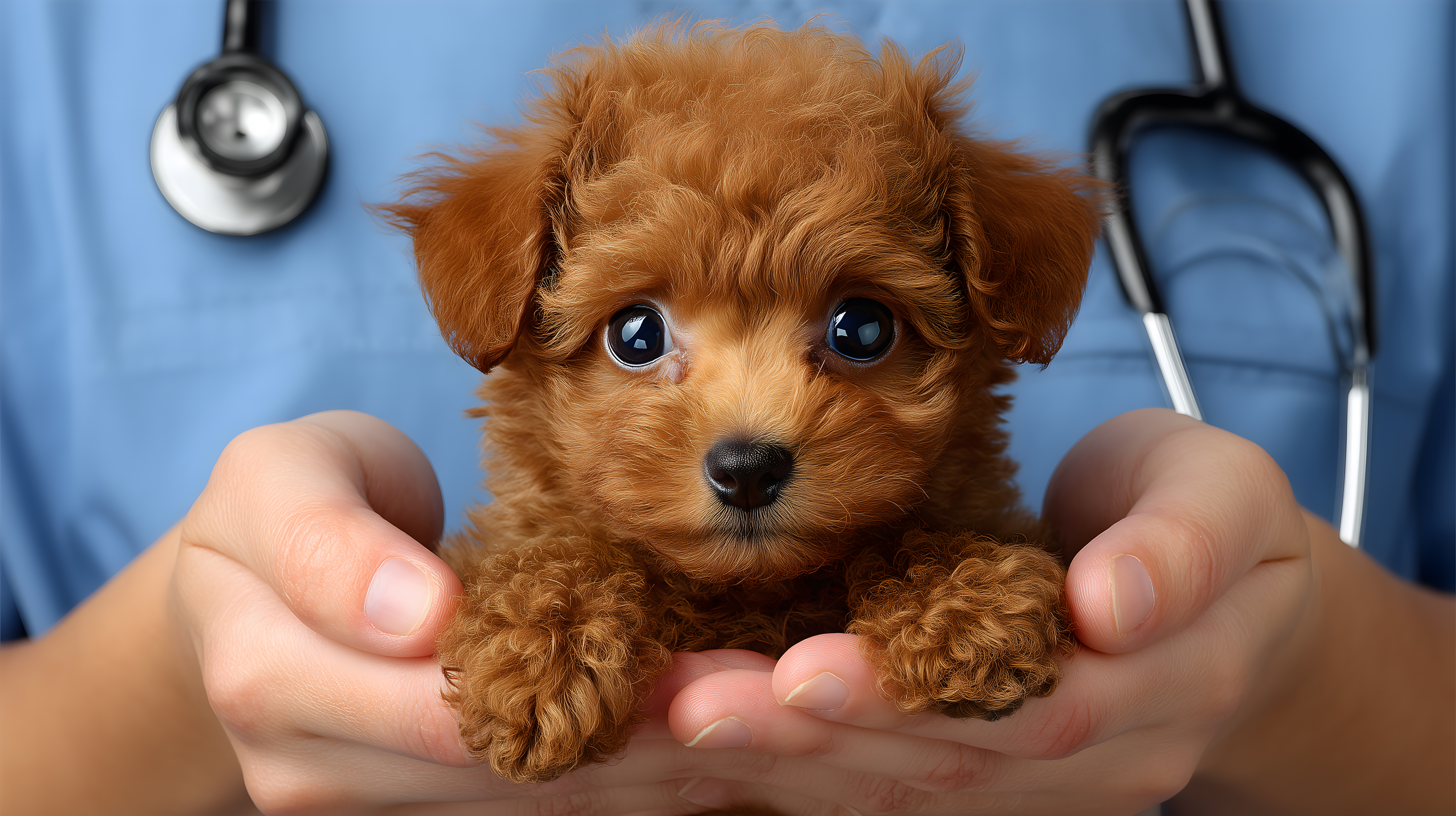 Das Bild zeigt einen entzückenden, braunen Pudelhund-Welpen, der von einem Menschen liebevoll in den Händen gehalten wird. Der Hund blickt mit großen, dunklen Augen direkt in die Kamera und sieht sehr süß und niedlich aus. Im Hintergrund sind ein Stethoskop und ein blauer Untersuchungskittel zu sehen, was darauf hindeutet, dass sich die Szene in einer Tierarztpraxis abspielt.