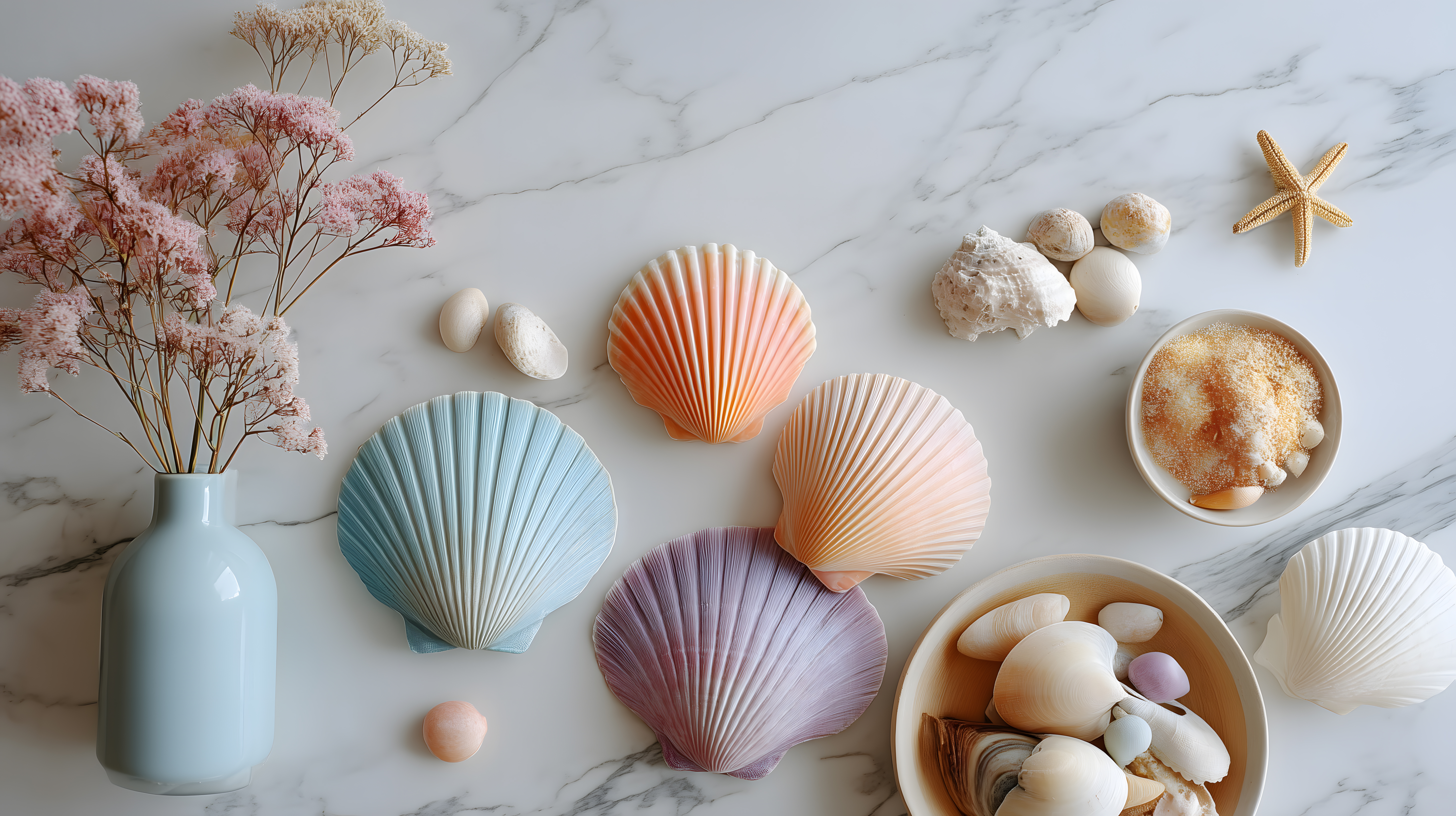 Dieses stimmungsvolle Foto zeigt eine elegante Dekoration aus Muscheln, Seesternen und weiteren Naturmaterialien auf einer edlen Marmorunterlage. Die sanften Pastelltöne der Muschelschalen harmonieren perfekt mit den zarten Blüten in der Vase. Das Arrangement vermittelt einen mediterranen, maritimen Charakter und eignet sich hervorragend als Inspiration für Tischdekoration, Fotografie oder Werbung in den Bereichen Lifestyle, Wohnen und Reise. Als hochaufgelöstes, kostenloses Stockfoto unter Creative-Commons-Lizenz ist es vielseitig einsetzbar.