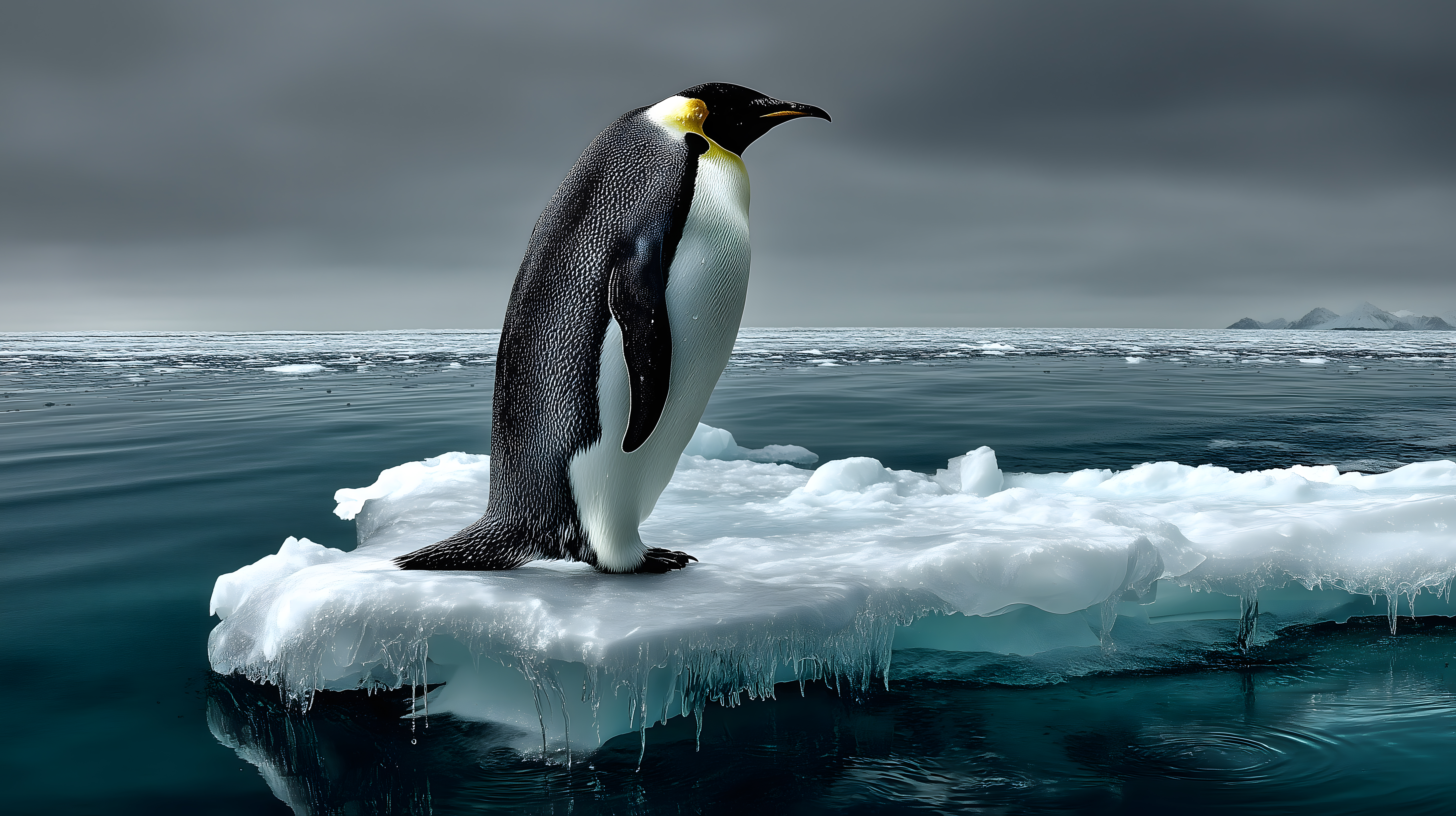 Das Foto zeigt einen einsamen Kaiserpinguin, der auf einer Eisscholle im Antarktischen Meer thront. Die düstere, graue Atmosphäre und die frostigen Eislandschaften im Hintergrund verleihen dem Bild eine stimmungsvolle und dramatische Ausstrahlung. Der Pinguin wirkt in seiner Pose sehr ruhig und nachdenklich, als würde er über seine Einsamkeit in dieser unwirtlichen Umgebung sinnieren. Dieses faszinierende Motiv eignet sich hervorragend als Hintergrundbild für Blogs, Newsletter oder Social-Media-Posts, die eine mystische oder bedrohliche Stimmung transportieren sollen. Das hochauflösende Foto steht unter einer Creative-Commons-Lizenz zur freien Verwendung zur Verfügung.