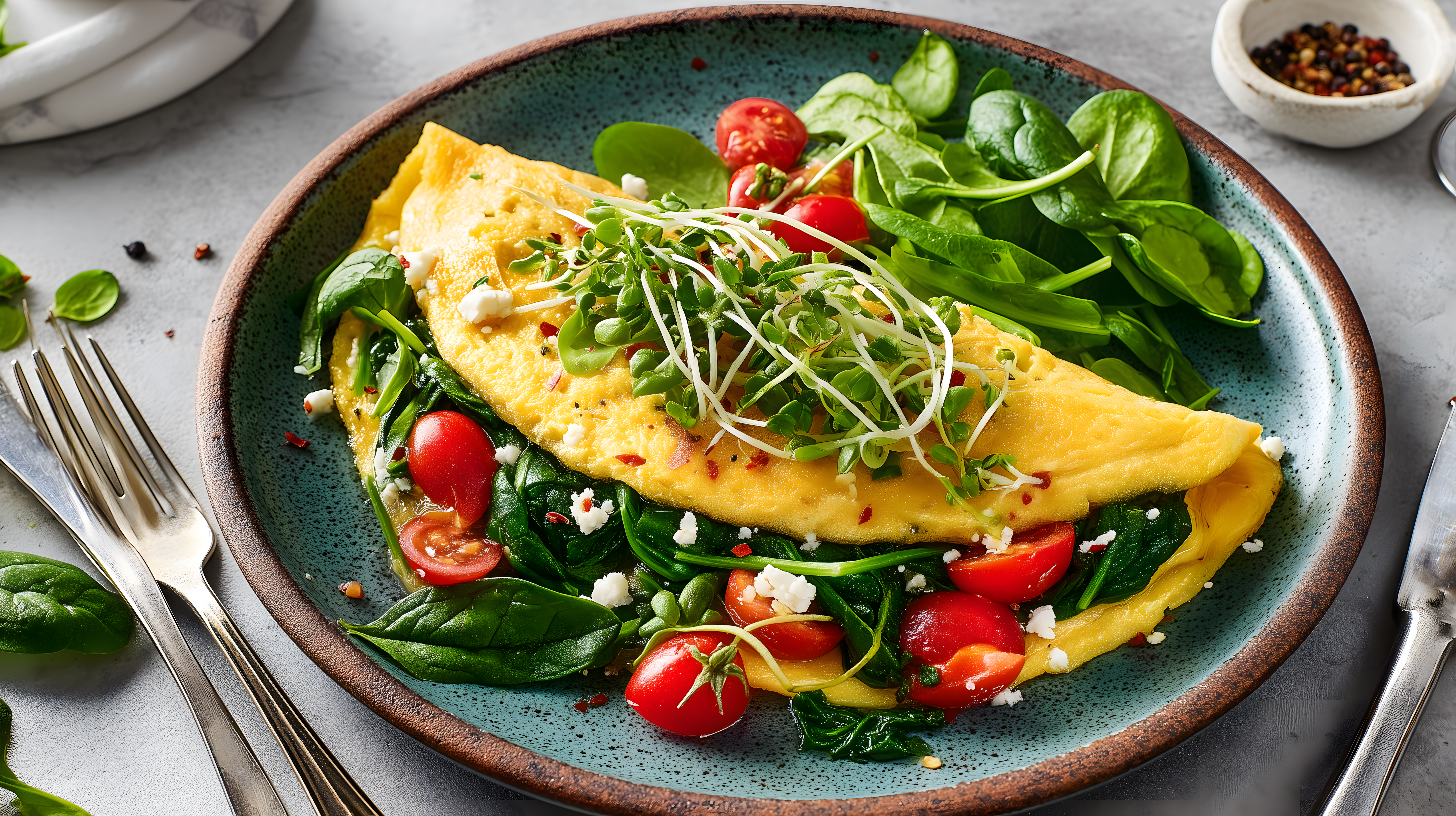 Dieses appetitliche Foto zeigt ein frisch zubereitetetes Spinat-Feta-Omelett, garniert mit Cherrytomaten und Sprossen. Die Speise ist auf einer rustikalen, grünen Keramikschüssel angerichtet, umgeben von Besteck und weiteren Zutaten wie Gewürzen. Das natürliche Licht und die farbenfrohe, übersichtliche Komposition machen das Bild zu einem stimmungsvollen, hochwertigen Stockfoto, das sich perfekt für Blogs, Newsletter, Social-Media-Beiträge oder Werbematerialien zum Thema gesunde Ernährung eignet. Dieses kostenlose Stockfoto in hoher Auflösung steht unter der Creative-Commons-Lizenz zur Verfügung.