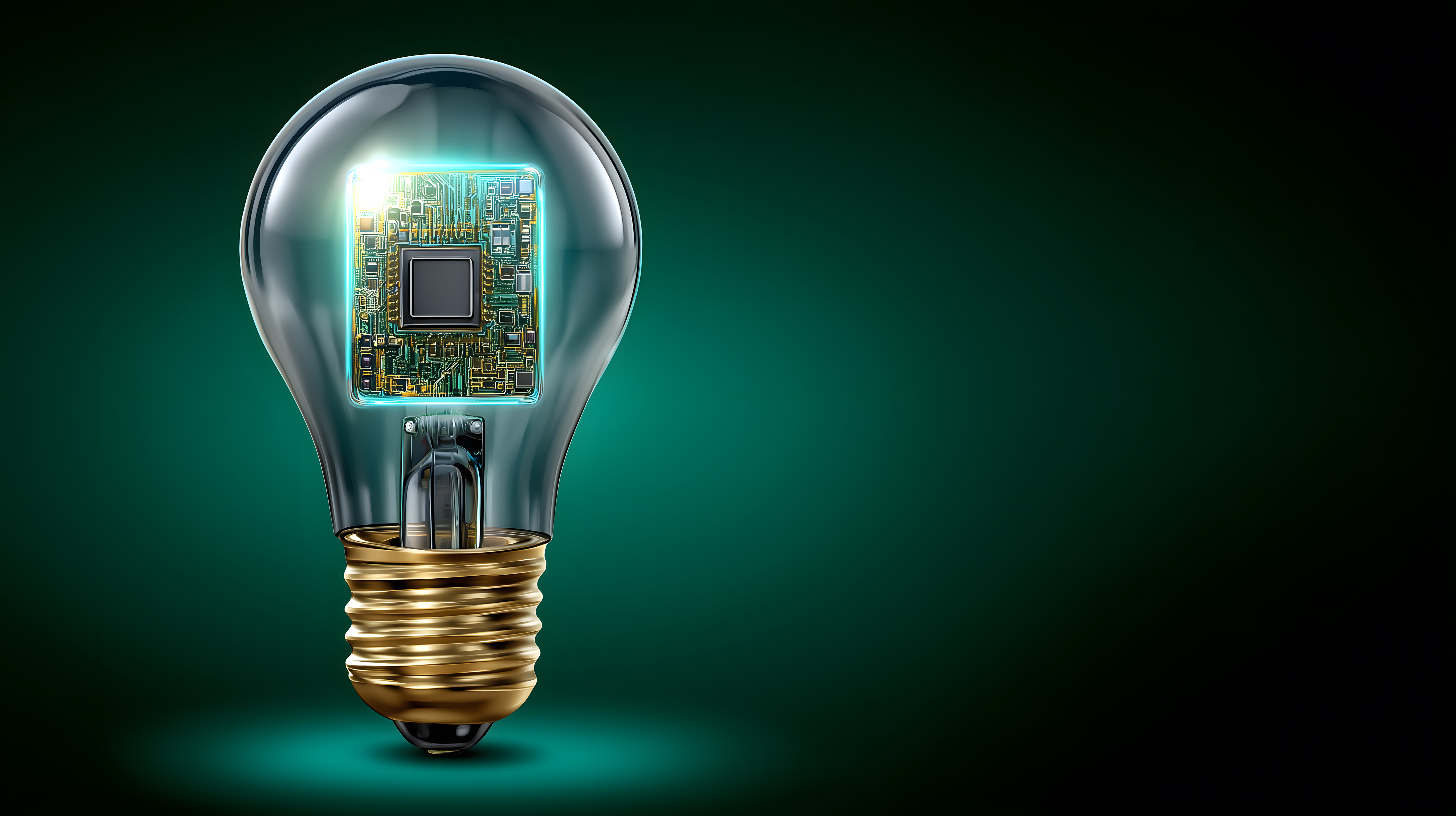 Das Bild zeigt eine Glühbirne, deren Inneres einen Mikrochip enthält. Die Birne ist vor einem dunkelgrünen Hintergrund platziert, der den Fokus auf die technologische Komponente im Inneren lenkt. Dieses Konzeptbild symbolisiert den Wandel von traditioneller zu intelligenter Beleuchtung und verkörpert den Übergang von analoger zu digitaler Technologie. Es eignet sich hervorragend für Beiträge zu Themen wie Digitalisierung, Innovation, Hightech oder den technologischen Fortschritt. Als hochwertiges Stockfoto in Profi-Qualität ist es kostenfrei und unter einer Creative-Commons-Lizenz für Blogs, Online-Magazine, Social-Media-Kanäle oder Werbematerialien verfügbar.