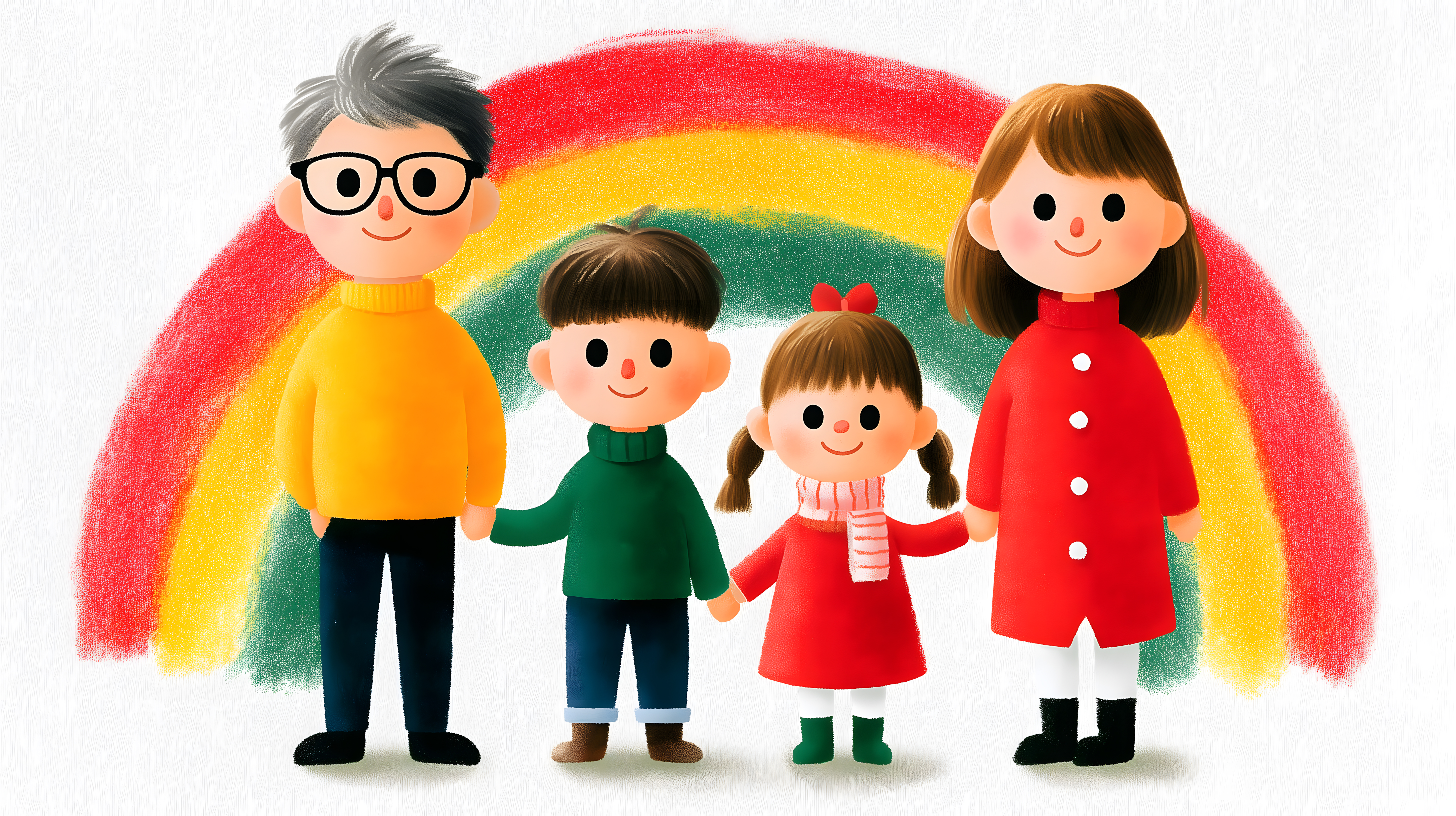 Dieses lebendige, handgezeichnete Bild zeigt eine fröhliche vierköpfige Familie vor einem bunten Regenbogen-Hintergrund. Die Eltern und zwei Kinder lächeln und halten sich an den Händen, was eine liebevolle, positive Stimmung vermittelt. Der Zeichenstil erinnert an Kinderbücher oder Cartoons, mit vereinfachten, ausdrucksstarken Figuren in einer bunten, fantasievollen Umgebung. Dieses charmante Stockfoto eignet sich perfekt für Anwendungen in Bereichen wie Familienwebsites, Kindermedien, Bildungsressourcen oder Werbung für Familienprodukte. Mit seiner hohen Auflösung und Creative-Commons-Lizenz ist es ein vielseitiges, kostenloses Bildmaterial für Ihre Projekte.
