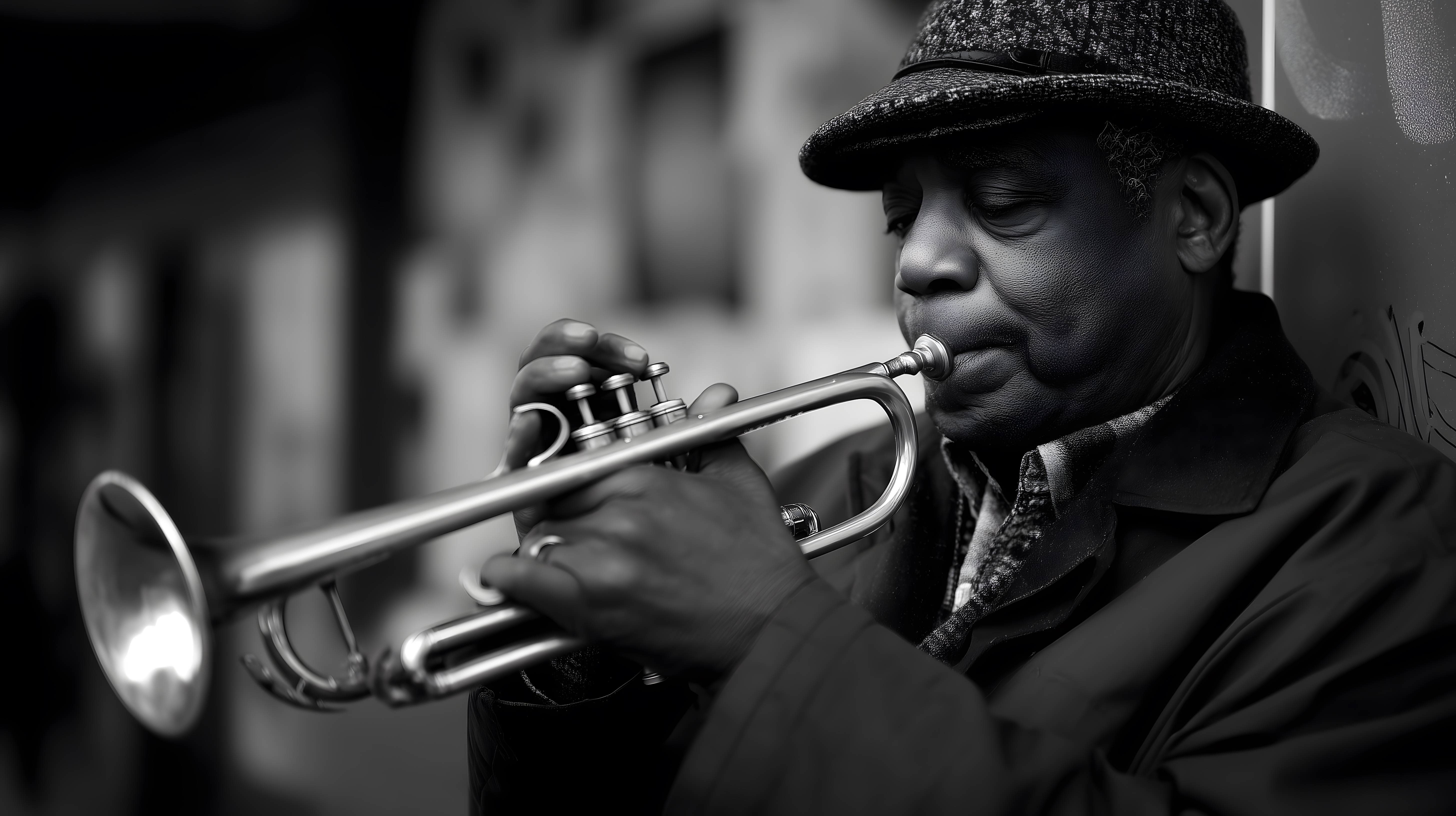 Das schwarz-weiße Foto zeigt einen Straßenmusiker, der eine Trompete spielt. Er ist in einer konzentrierten Haltung zu sehen, mit geschlossenen Augen und tief in seine Performance versunken. Das Bild vermittelt eine authentische, nostalgische Atmosphäre und lässt den Betrachter an die Faszination der Straßenmusik teilhaben. Es eignet sich hervorragend für Beiträge über Kunst, Kultur, Musik und das Stadtleben. Dieses hochauflösende Stockfoto steht unter einer Creative-Commons-Lizenz und kann kostenfrei für verschiedene Zwecke wie Blogs, Newsletter oder Werbematerial genutzt werden.
