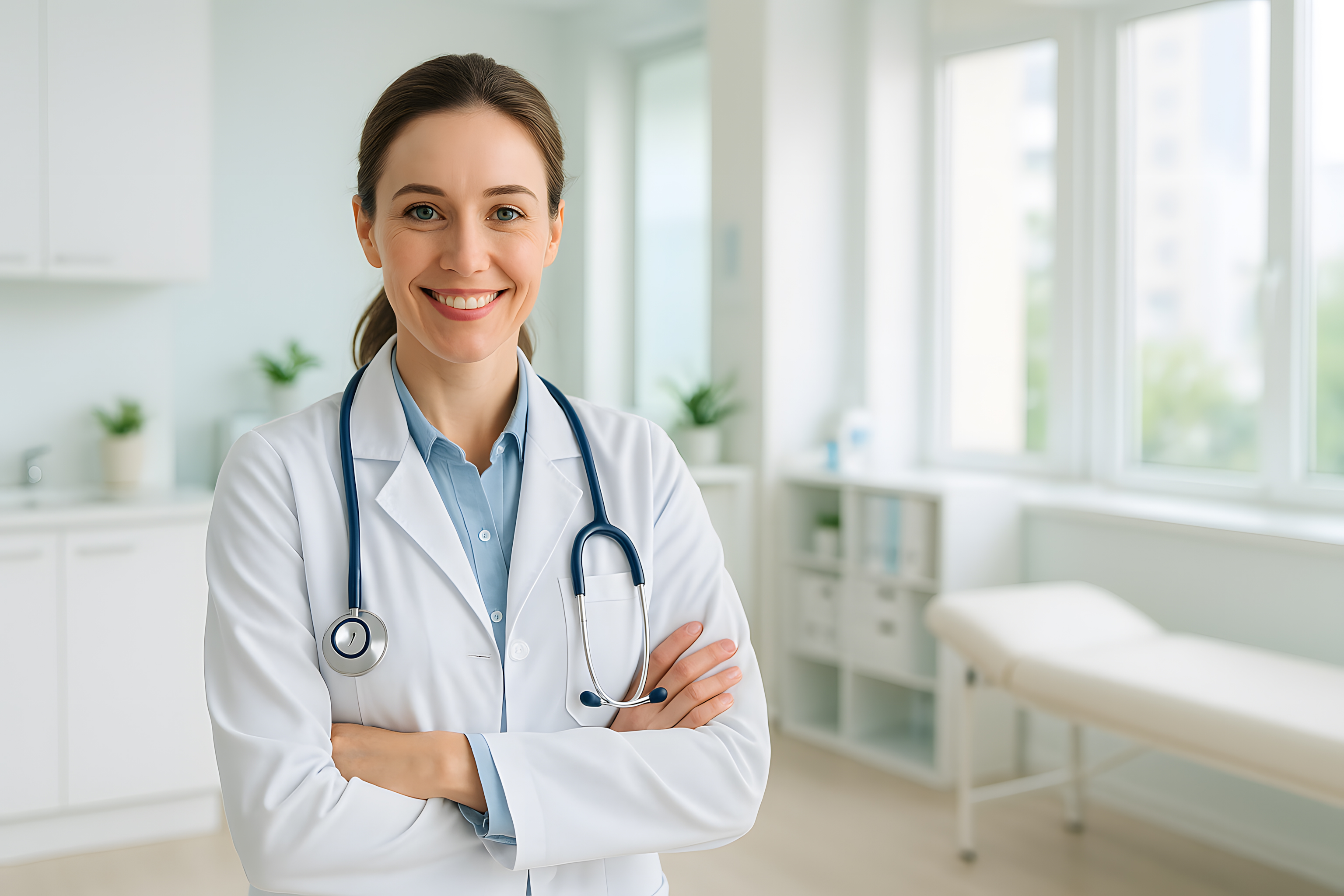 Das Bild zeigt eine lächelnde, weibliche Ärztin in einem modernen Klinikumfeld. Sie trägt einen weißen Arztkittel mit Stethoskop um den Hals und steht vor einer großen Fensterfront, die einen hellen, freundlichen Arbeitsbereich schafft. Ihre Körperhaltung, ihr offener Gesichtsausdruck und ihr freundliches Lächeln vermitteln Kompetenz, Professionalität und Vertrauenswürdigkeit. Dieses Stockfoto eignet sich hervorragend für Webseiten, Blogs, Newsletter oder Werbekampagnen im Gesundheitsbereich, da es eine positive und vertrauensvolle Atmosphäre schafft. Die hochwertige Auflösung und Creative-Commons-Lizenz machen es zu einer kostenlosen, vielseitig einsetzbaren Bildressource.