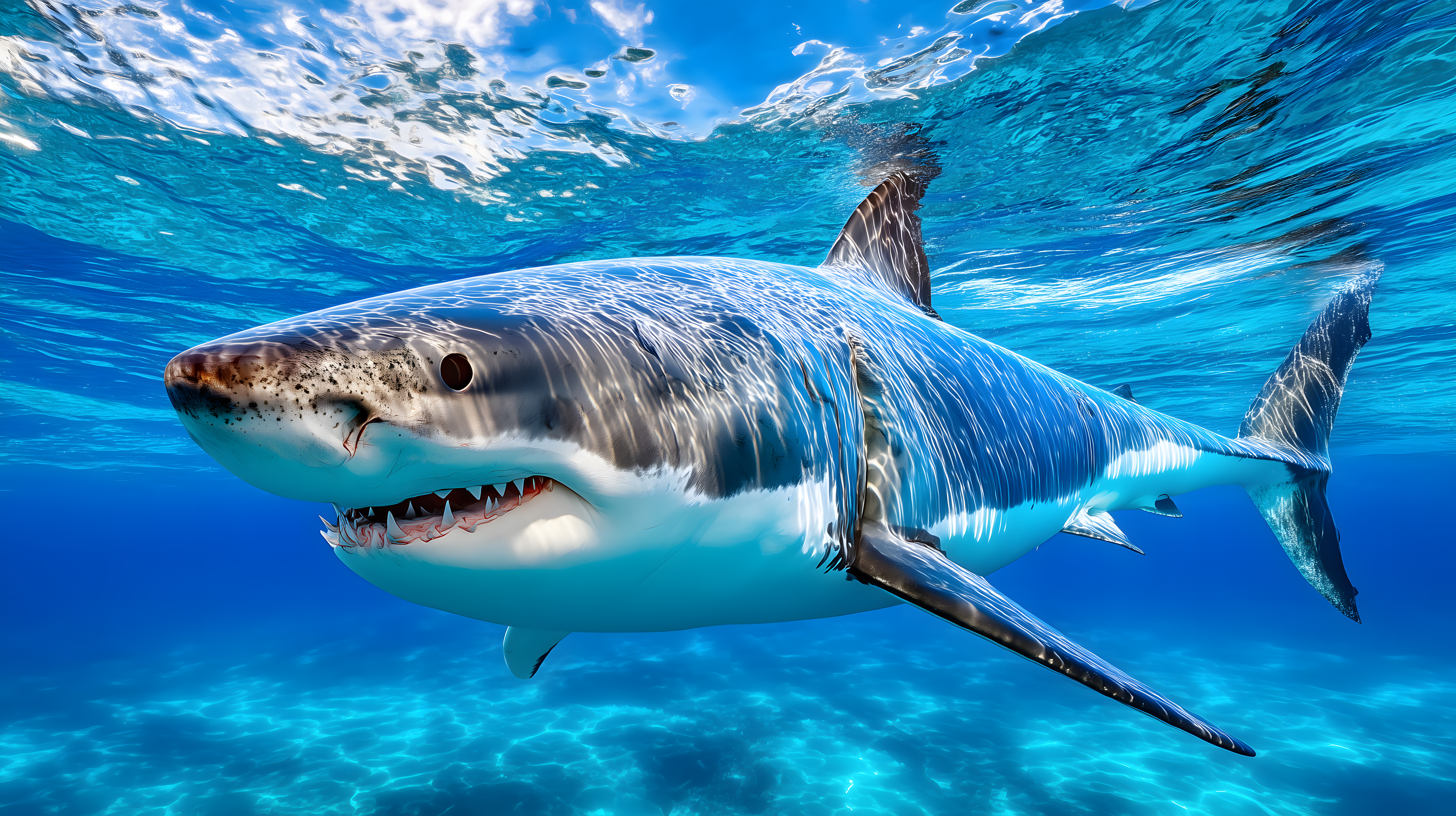 Dieses atemberaubende Foto zeigt einen majestätischen Weißen Hai, der durch den türkisblauen Ozean gleitet. Mit seiner imposanten Größe und den mächtigen Flossen vermittelt das Raubtier eine faszinierende Mischung aus Kraft und Eleganz. Die Perspektive unter Wasser lässt den Betrachter die Schönheit und Bedrohlichkeit dieser Spezies hautnah erleben. Das Bild eignet sich perfekt für Blogs, Newsletter, Social-Media-Beiträge oder Werbekampagnen rund um Themen wie Unterwasserwelt, Meeresschutz oder Abenteuerreisen. Als kostenloses Stockfoto in hoher Auflösung und unter der Creative-Commons-Lizenz ist es eine großartige Ressource für Ihre visuellen Projekte.