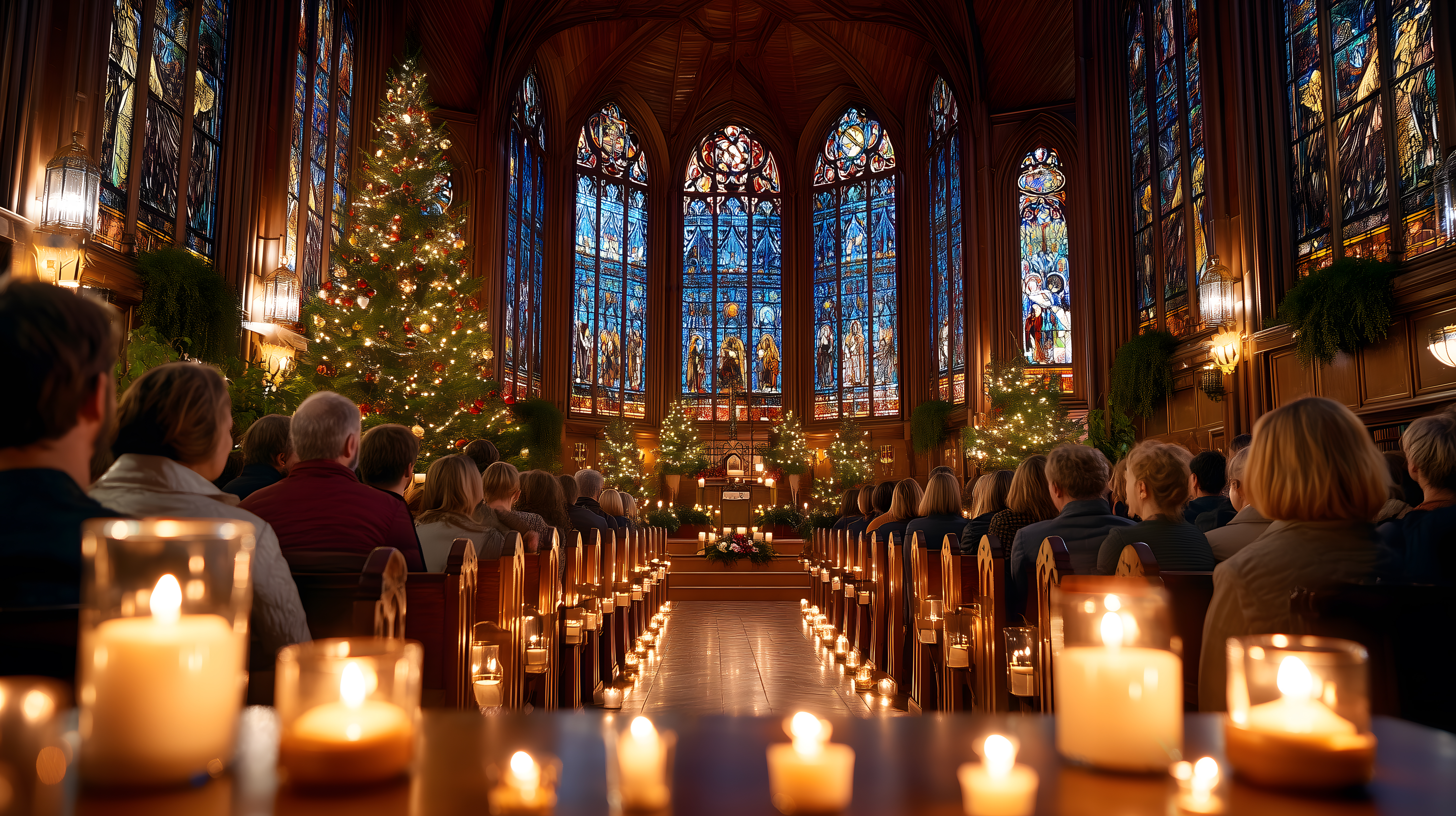 Dieses beeindruckende Foto zeigt den Innenraum einer prachtvoll geschmückten Kirche an Weihnachten. Der Raum ist erfüllt von warmem Kerzenlicht, das sich in den farbenfrohen Buntglasfenstern spiegelt. Ein prachtvoller Weihnachtsbaum steht im Mittelgang, umgeben von Reihen voller gläubiger Besucher, die andächtig der Feier beiwohnen. Die Stimmung ist festlich und stimmungsvoll, geprägt von Tradition, Spiritualität und der Verbundenheit einer Gemeinschaft. Dieses Foto eignet sich hervorragend als kostenloses Stockfoto für Weihnachtsdekorationen, Artikel zu Feiertagen und Traditionen oder für weihnachtliche Designs in Blogs, Newslettern oder Social-Media-Beiträgen. Die hochauflösende Datei steht unter einer Creative-Commons-Lizenz zur Verfügung.