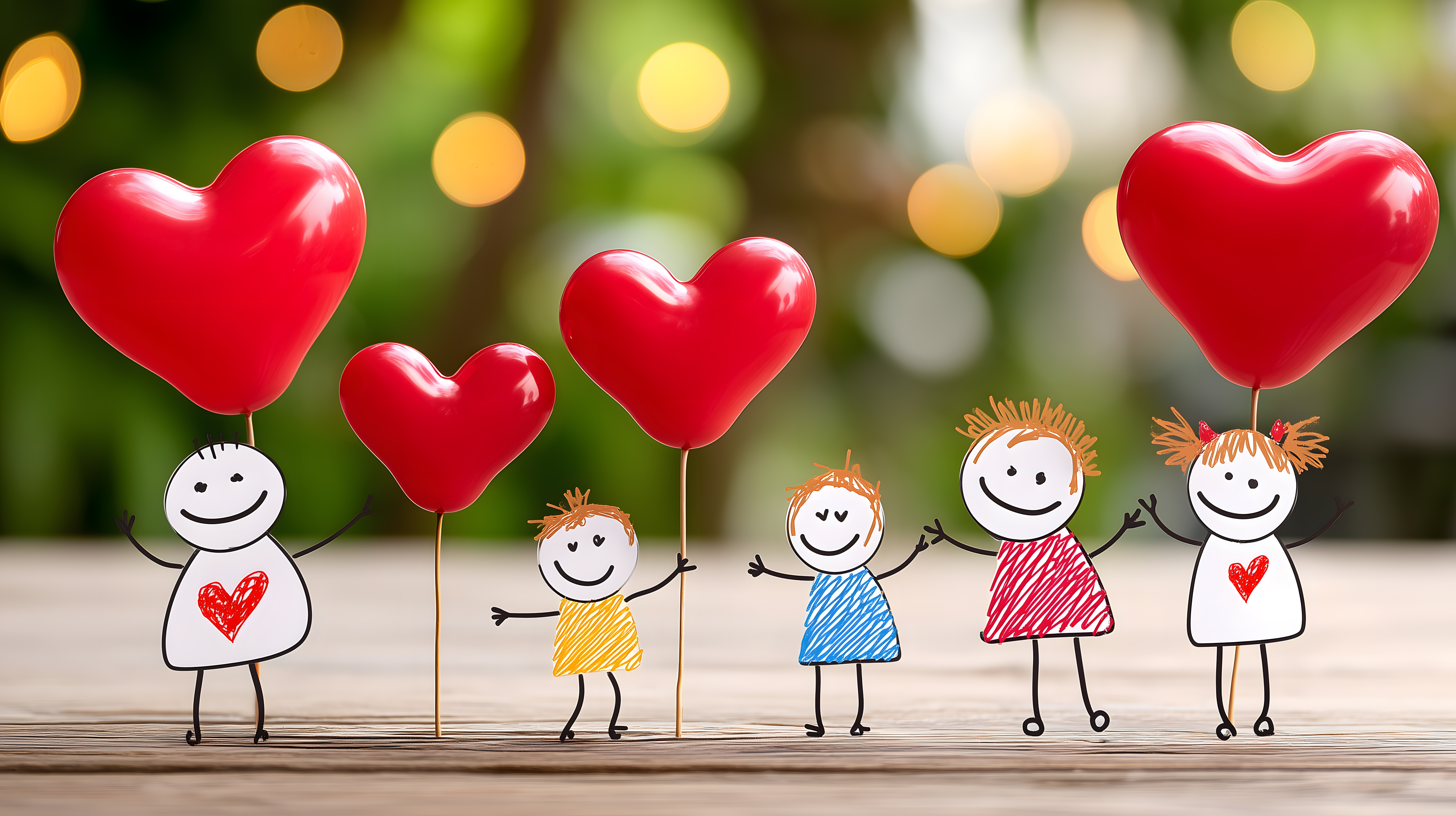 Das Bild zeigt eine fröhliche und bunte Szene mit roten Herzballons und handgezeichneten Strichmännchen vor einem unscharfen, grünen Hintergrund mit Bokeh-Effekt. Die Strichmännchen halten die Herzballons und strecken ihre Arme in die Höhe, was eine Stimmung der Freude und Verbundenheit vermittelt. Das Motiv eignet sich perfekt als Muttertagsgrußkarte, für Blogbeiträge oder Social-Media-Posts rund um den Themen Liebe, Familie und Geborgenheit. Das hochwertige Stockfoto ist in hoher Auflösung und unter einer Creative-Commons-Lizenz kostenfrei für private und kommerzielle Zwecke nutzbar.