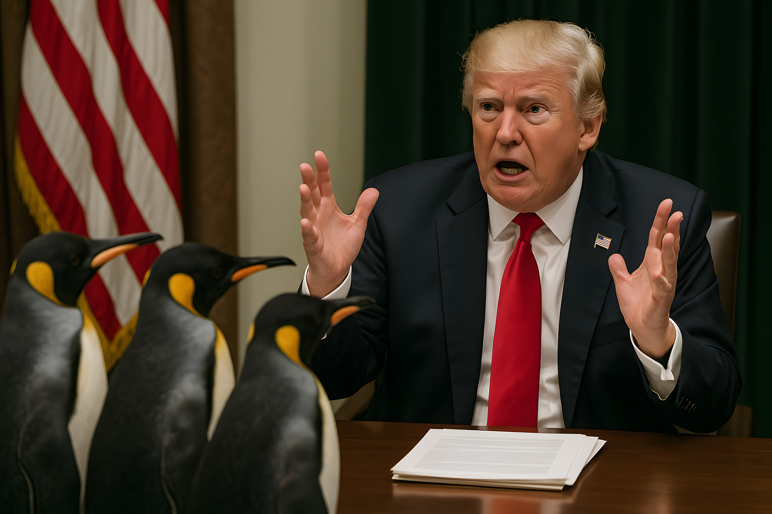 Das Bild zeigt einen Geschäftsmann in einem Anzug, der offenbar mit Pinguinen an einem Konferenztisch diskutiert. Der Mann gestikuliert wild mit den Händen, was auf eine angeregte Diskussion hindeutet. Die Pinguine sitzen schweigend da, als würden sie dem Redner aufmerksam zuhören. Die Szenerie wirkt satirisch und karikaturhaft, möglicherweise als Kommentar zu politischen Entscheidungsprozessen. Das Bild könnte in Blogbeiträgen, sozialen Medien oder Werbematerialien eingesetzt werden, um das Thema Führung, Autorität oder politische Entscheidungsfindung auf humorvolle Art darzustellen. Als kostenloses Stockfoto in hoher Auflösung und unter Creative-Commons-Lizenz könnte es vielfältig genutzt werden.