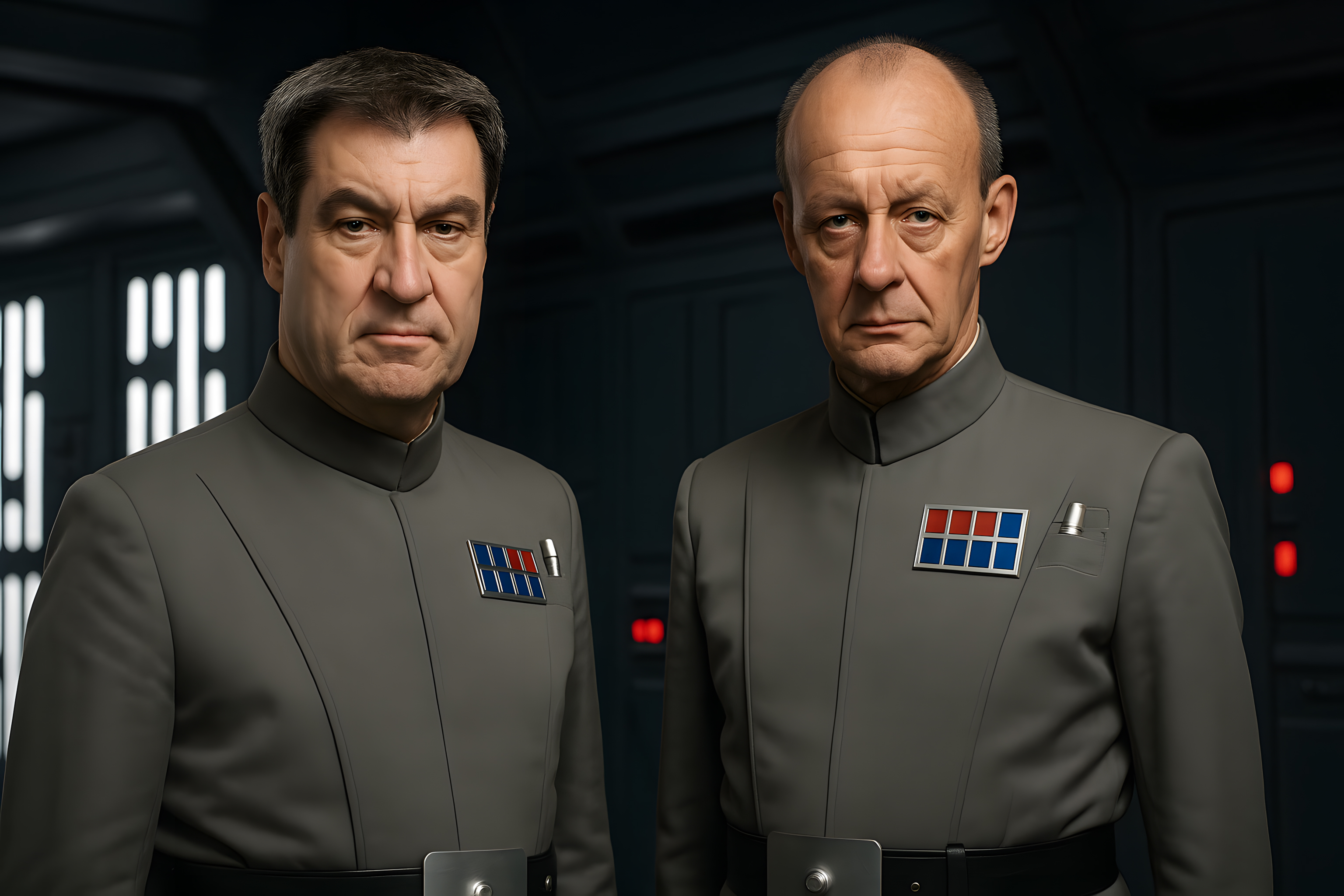Das Bild zeigt zwei Politiker in Uniform, die an Charaktere aus der Star Wars-Filmreihe erinnern. Der dunkelgraue Anzug mit markanten Abzeichen und Details in Militäroptik verleiht dem Motiv einen futuristischen, fast schon dystopischen Charakter. Die ernsten Gesichtsausdrücke der Dargestellten tragen zusätzlich zur imposanten und beeindruckenden Wirkung des Fotos bei. Dieses Stockbild eignet sich hervorragend für redaktionelle Zwecke wie Blogs, Newsletter oder Social-Media-Beiträge mit Bezug zu Politik, Science-Fiction oder überraschenden Bildkonzepten. Das hochauflösende Foto ist unter einer Creative Commons-Lizenz frei nutzbar.