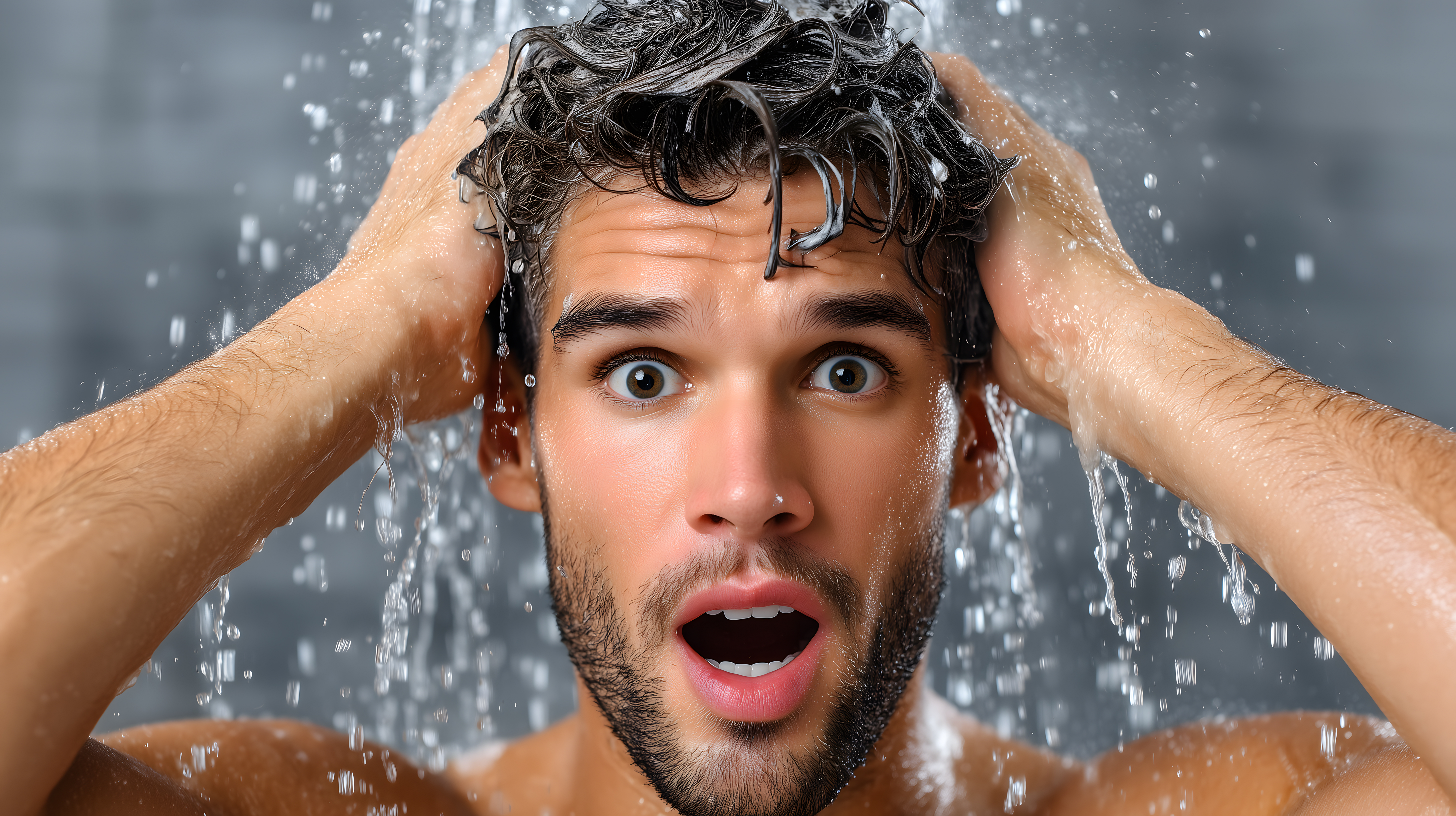 Das Bild zeigt einen jungen Mann mit Bart, der seine Haare unter Wasser wäscht. Er steht unter einem Wasserstrom und verwendet Shampoo, um seine Haare zu reinigen. Seine Augen sind weit aufgerissen, was den Eindruck einer erfrischenden Dusche verstärkt. Die Szene ist in kühlen Blautönen gehalten und vermittelt einen Eindruck von Sauberkeit und Frische. Dieses Foto eignet sich hervorragend für Verwendungen in Blogbeiträgen, Newslettern, Social-Media-Posts oder Werbematerialien zum Thema Pflege, Wellness und Gesundheit. Als kostenloses Stockfoto in hoher Auflösung und unter Creative-Commons-Lizenz kann es vielfältig eingesetzt werden.