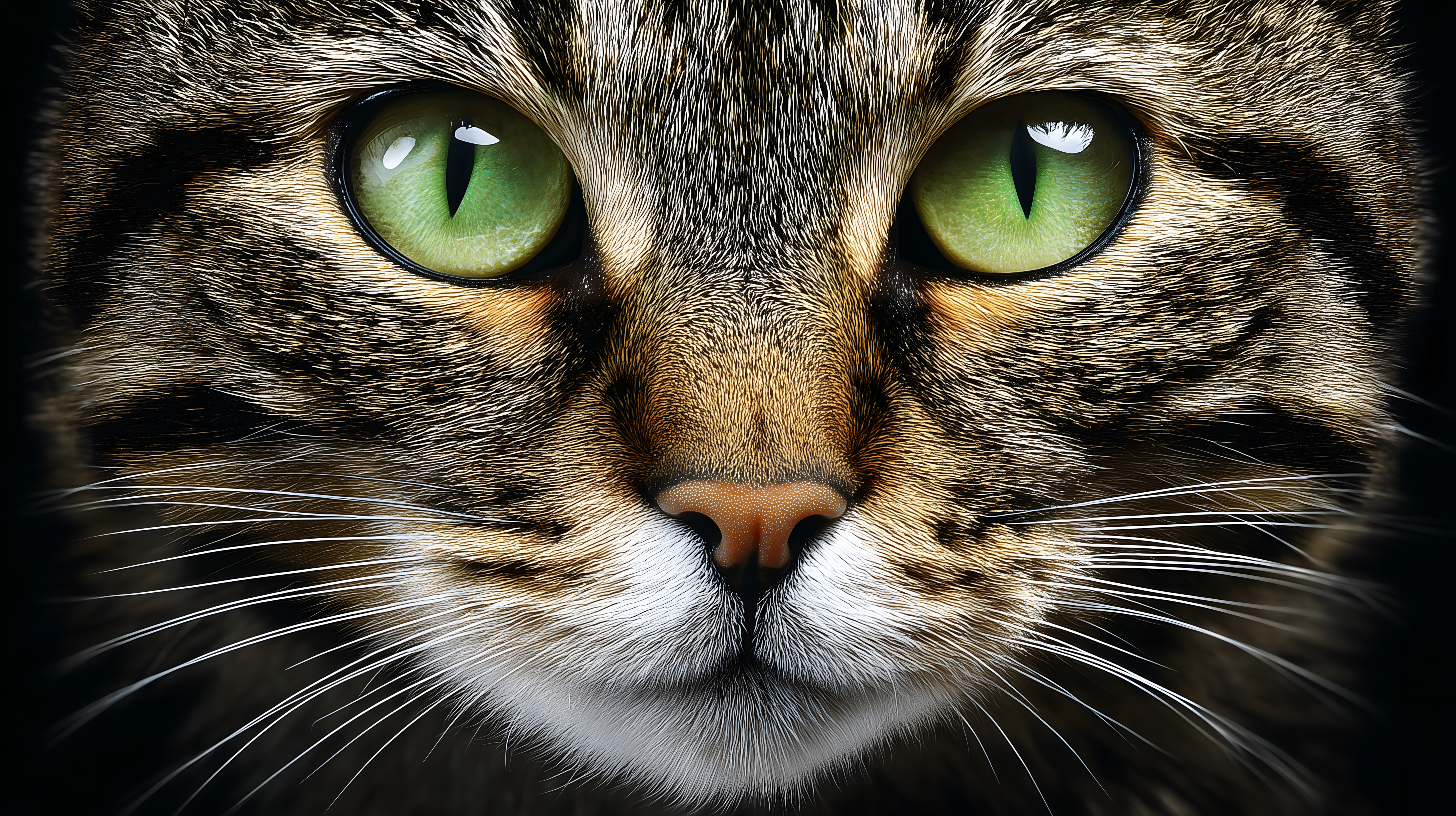Dieses Foto zeigt eine detaillierte Nahaufnahme eines Katzenkopfes mit intensiv grünen, ausdrucksstarken Augen und der charakteristischen Fellstruktur. Die zentrale Perspektive rückt die Augen und die Nase des Tieres in den Fokus, was eine faszinierende Detailansicht bietet. Das Bild eignet sich hervorragend als kostenloses Stockfoto für den Einsatz in Blogs, Newslettern, Social-Media-Beiträgen oder Werbematerial, wo es eine natürliche, hochauflösende Optik und Stimmung vermittelt. Es steht unter einer Creative-Commons-Lizenz zur freien Nutzung zur Verfügung.