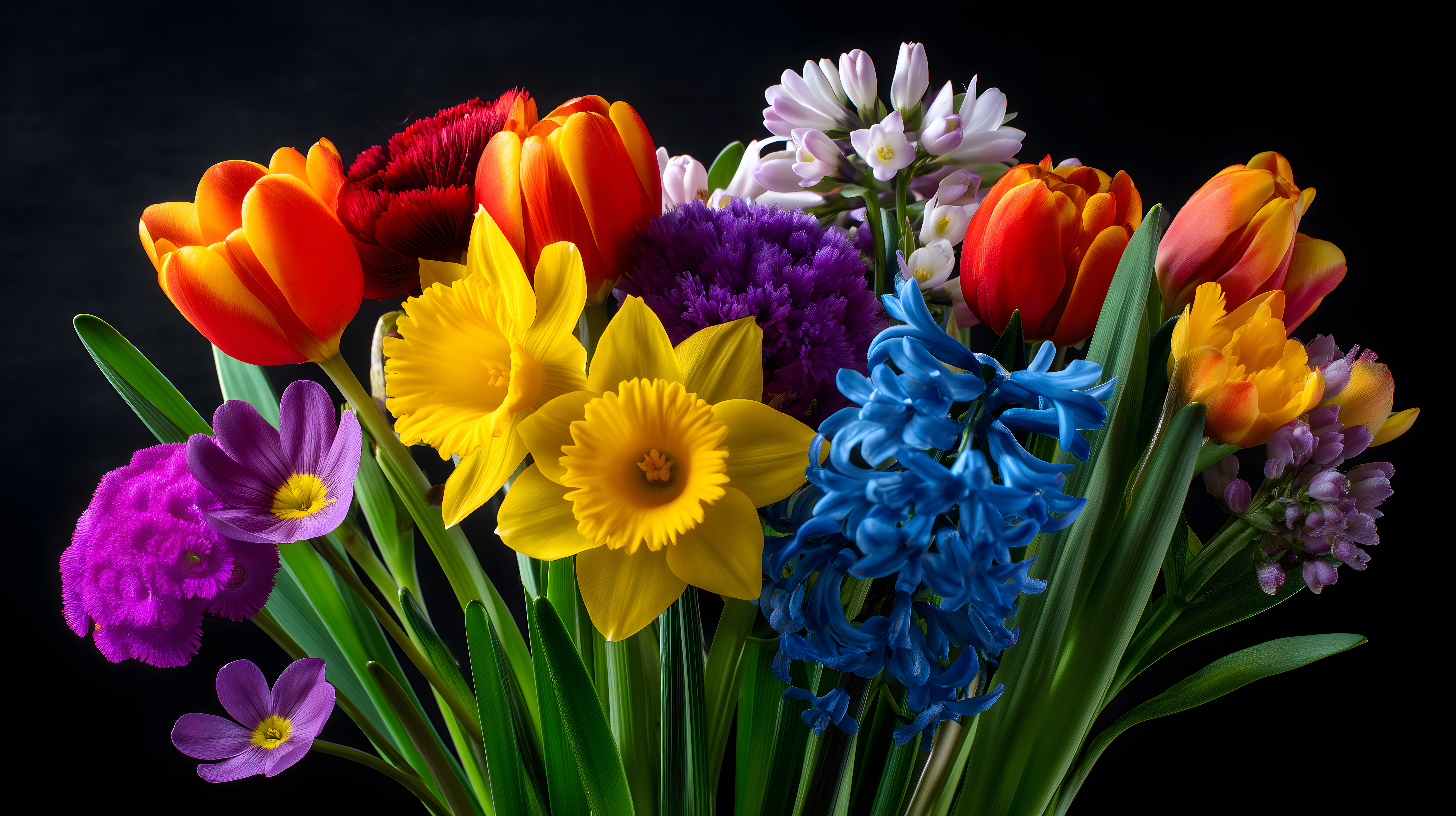 Dieses wunderschöne Foto zeigt einen farbenfrohen Strauß aus Frühlingsblumen vor einem dunklen Hintergrund. Die Komposition aus leuchtenden Tulpen, Narzissen, Hyazinthen und Krokussen in verschiedenen Gelb-, Orange-, Rot- und Lila-Tönen erzeugt eine lebendige, frische Atmosphäre. Das Foto eignet sich hervorragend für den Einsatz in Blogs, Newslettern, Social-Media-Beiträgen oder Werbematerialien rund um das Thema Frühling. Als kostenloses Hochauflösungsfoto unter Creative-Commons-Lizenz kann es frei verwendet werden.