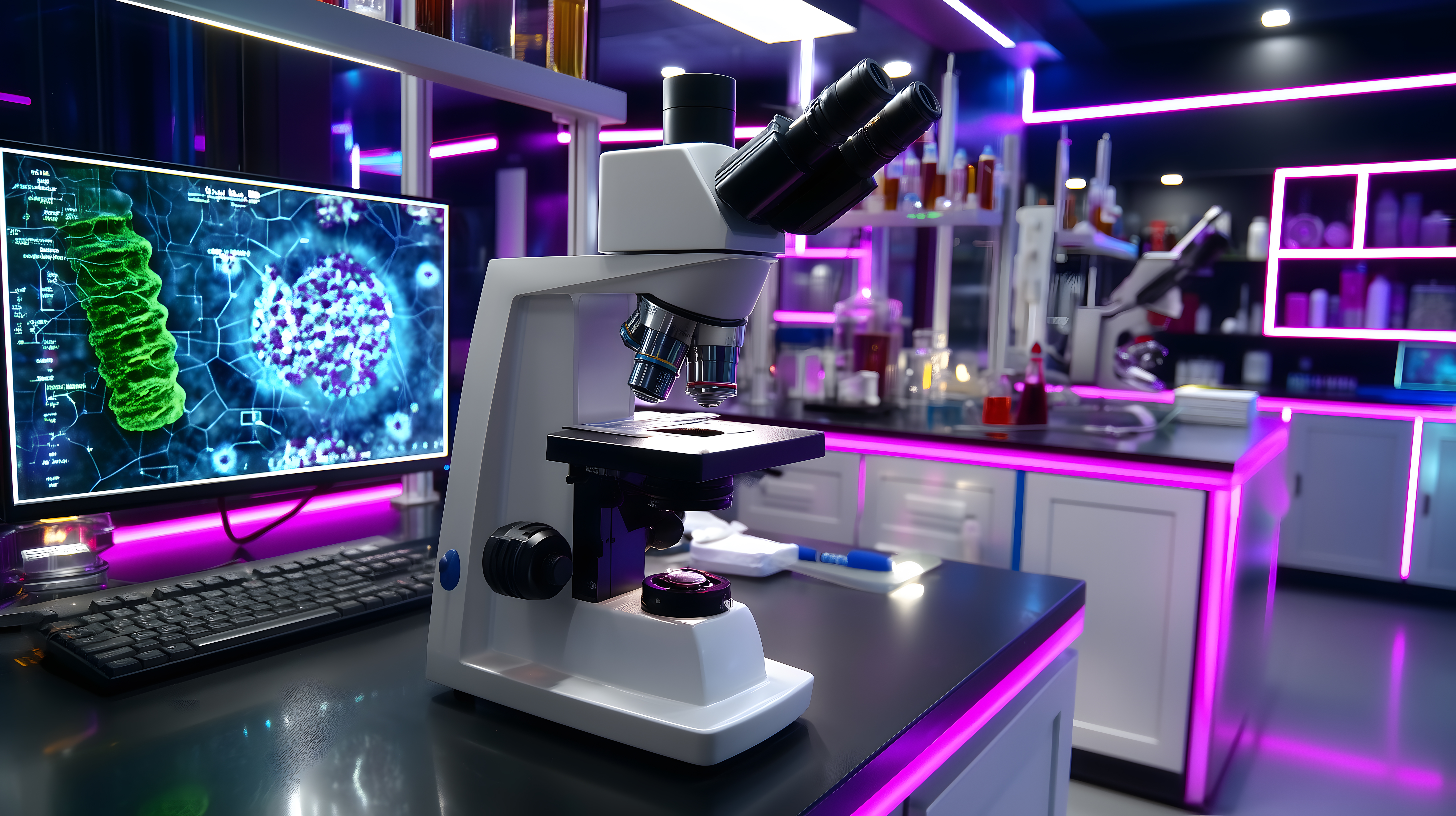 Dieses Foto zeigt ein hochmodernes Forschungslabor, ausgestattet mit einem hochentwickelten Mikroskop und modernster digitaler Ausrüstung. Der Arbeitsplatz ist mit einem großen Bildschirm, der eine komplexe molekulare Struktur darstellt, sowie einem leistungsstarken Mikroskop ausgestattet. Die Beleuchtung in Lila-, Blau- und Grüntönen verleiht dem Labor eine futuristische, innovative Atmosphäre. Dieses hochauflösende Stockfoto unter Creative-Commons-Lizenz eignet sich hervorragend für die Verwendung in Blogs, Newslettern, Social-Media-Beiträgen oder Werbematerialien, um ein Gefühl von High-Tech-Forschung und Wissenschaft zu vermitteln.
