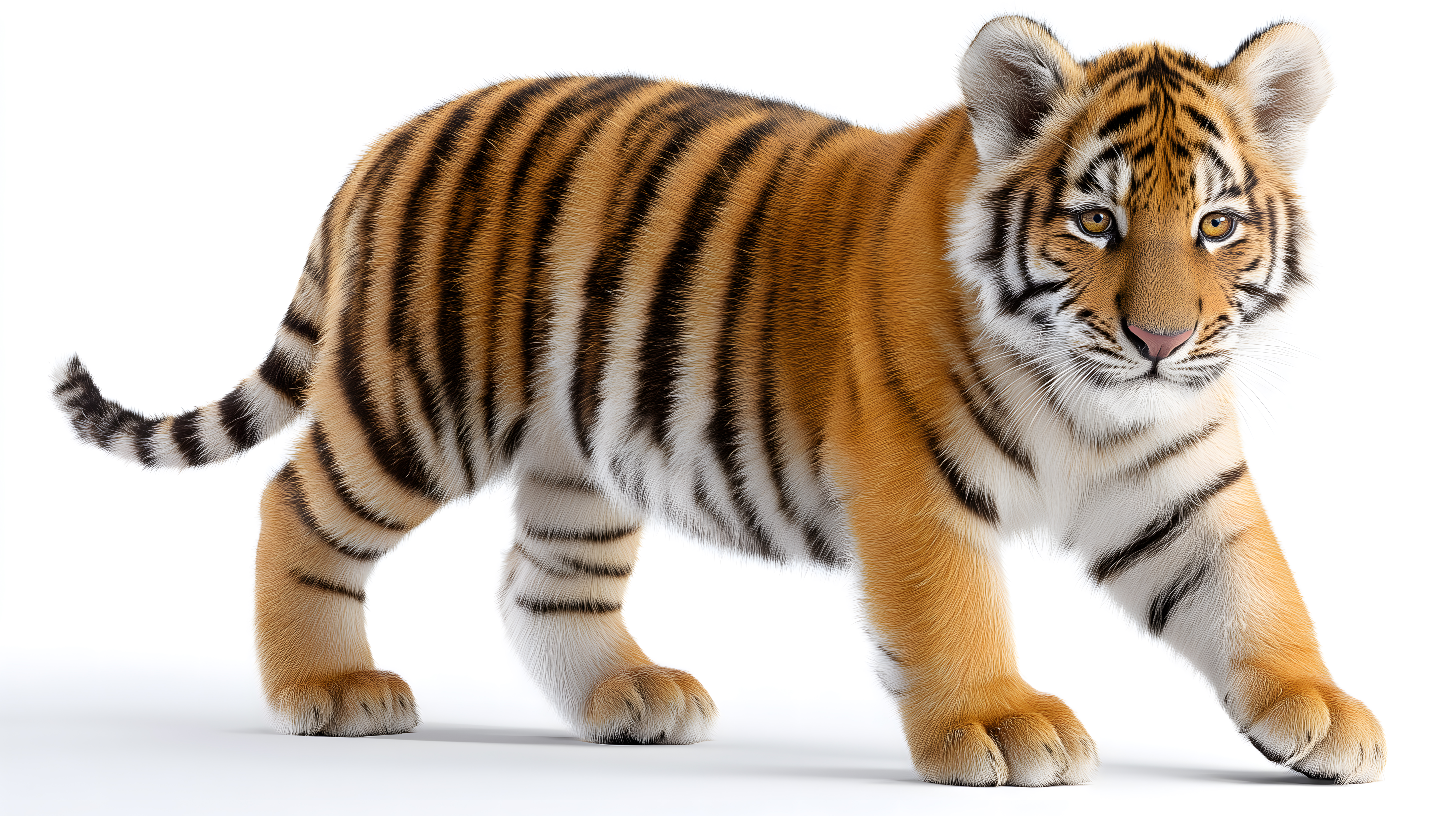 Dieses eindrucksvolle Foto zeigt einen jungen Tiger, der neugierig und aufmerksam auf einem weißen Hintergrund steht. Das Raubtier ist sehr detailliert abgebildet, mit seinem markanten, gestreiften Fell, den kräftigen Gliedmaßen und dem wachsamen Blick. Das Bild eignet sich hervorragend für den Einsatz in Blogs, Newslettern, sozialen Medien oder Werbekampagnen rund um Themen wie Tierschutz, Naturschutz oder die faszinierende Tierwelt. Als kostenloses Stockfoto in hoher Auflösung und unter Creative-Commons-Lizenz kann es flexibel genutzt werden.