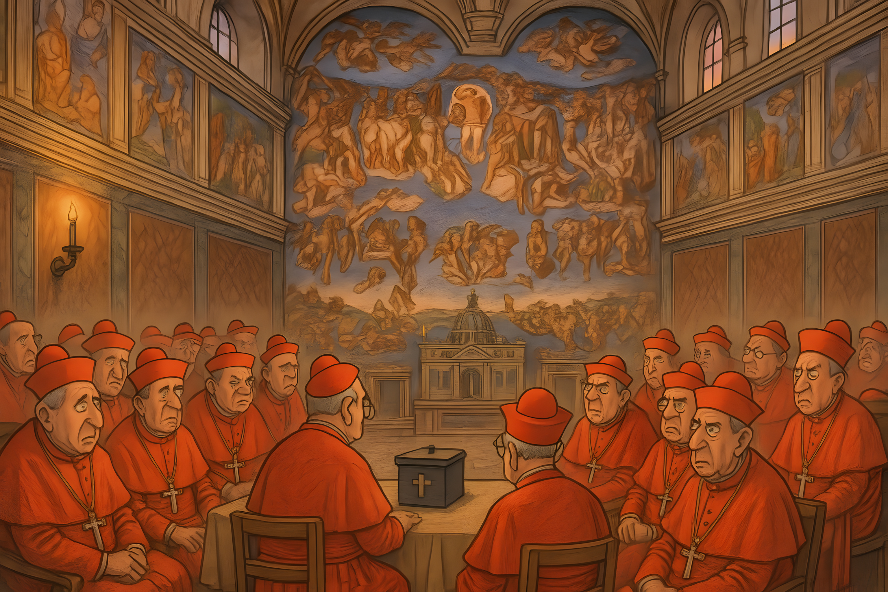 Das Bild zeigt eine feierliche Versammlung von Kardinälen in der Sixtinischen Kapelle im Vatikan. Im Zentrum steht eine Kiste, die vermutlich die Wahlurne für die Papstwahl darstellt. Die Kardinäle, erkennbar an ihren roten Gewändern, sitzen in ehrfürchtiger Haltung um den Altar herum. Im Hintergrund ist ein beeindruckendes Fresko zu sehen, das eine biblische Szene zeigt. Die detailreiche Darstellung mit der prächtigen Architektur und den traditionellen Kostümen vermittelt den Ernst und die Bedeutung des Konklaves, der Versammlung zur Wahl des nächsten Papstes. Dieses hochwertige Stockfoto eignet sich hervorragend für Artikel, Präsentationen oder Werbematerialien rund um das Thema Katholizismus, Kirchengeschichte oder päpstliche Traditionen. Die hohe Auflösung und die Creative-Commons-Lizenz erlauben eine vielfältige und kostenfreie Nutzung.