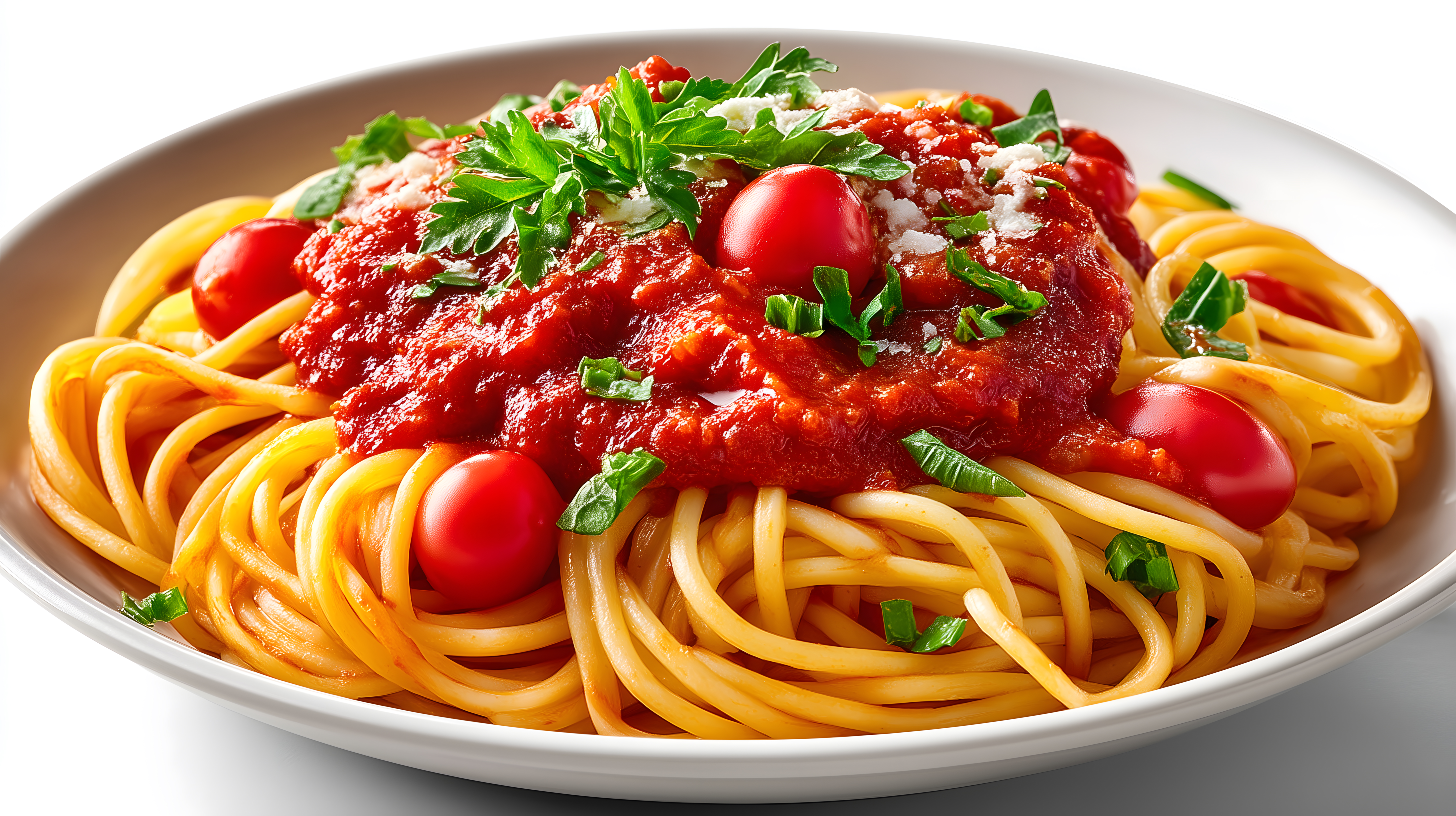 Dieses Foto zeigt eine appetitlich angerichtete Portion Pasta mit einer reichhaltigen Tomatensauce und frischen Kräutern. Die roten Tomaten, das tiefe Rot der Sauce und die grünen Basilikumblätter ergeben einen lebendigen Farbkontrast auf dem hellen Teller. Die Spaghetti sind perfekt al dente gekocht und bilden die Basis für dieses klassische italienische Gericht. Dieses Bild eignet sich hervorragend für die Verwendung in Rezeptblogs, Kochbüchern, Restaurantwebsites oder Werbematerialien rund um italienische Küche und Lebensmittel. Als hochauflösendes, kostenloses Stockfoto unter Creative-Commons-Lizenz kann es vielfältig eingesetzt werden.