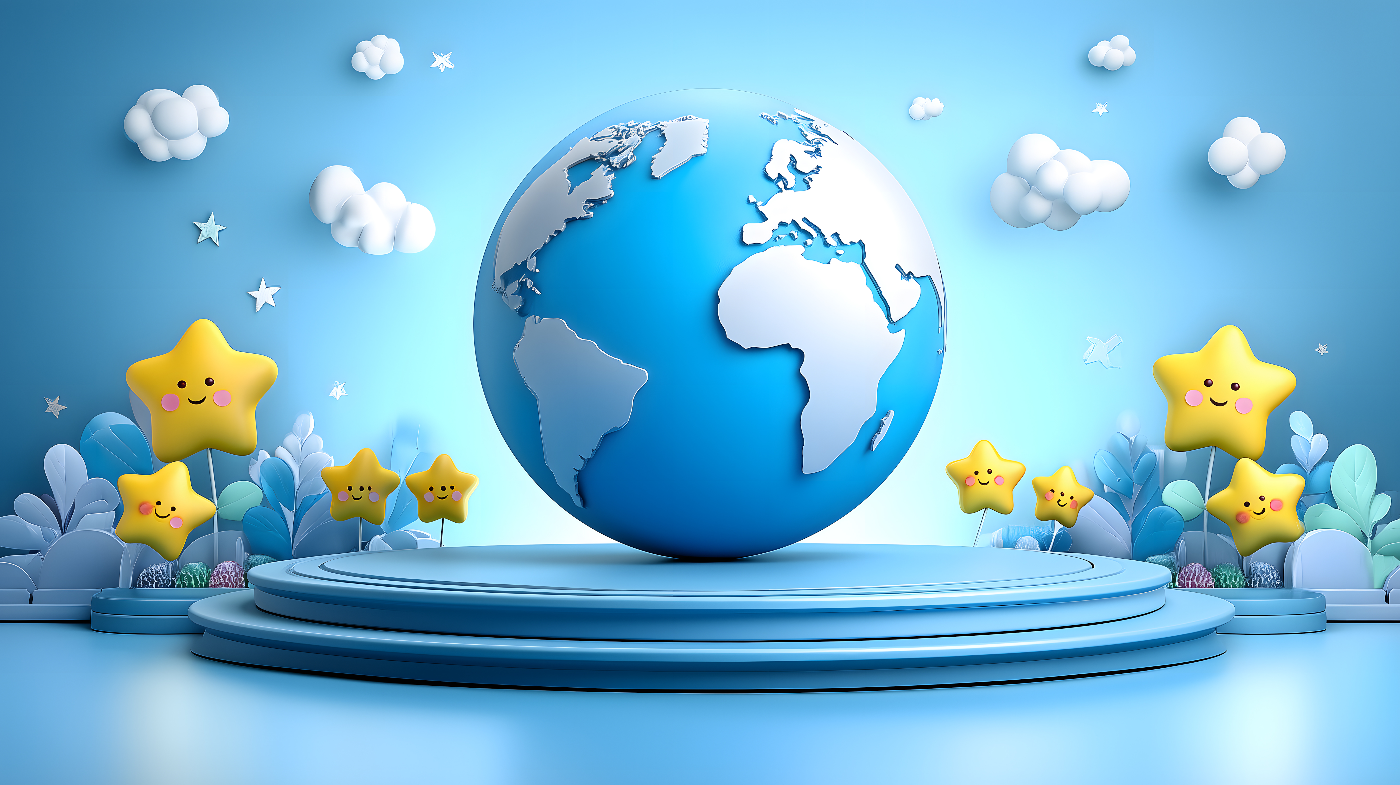 Das Bild zeigt eine detaillierte 3D-Illustration einer lachenden Weltkugel vor einem strahlend blauen Himmel mit weißen Wolken und leuchtenden Sternen. Die fröhlichen, lächelnden gelben Sterne umringen den Globus und verleihen der Szene eine freundliche, einladende Atmosphäre. Diese Darstellung der Erde könnte perfekt als Hintergrund für Werbung, Social-Media-Beiträge oder Newsletter verwendet werden. Als kostenloses Stockfoto in hoher Auflösung und unter Creative-Commons-Lizenz ist dieses Bild ideal für eine Vielzahl von digitalen Projekten.