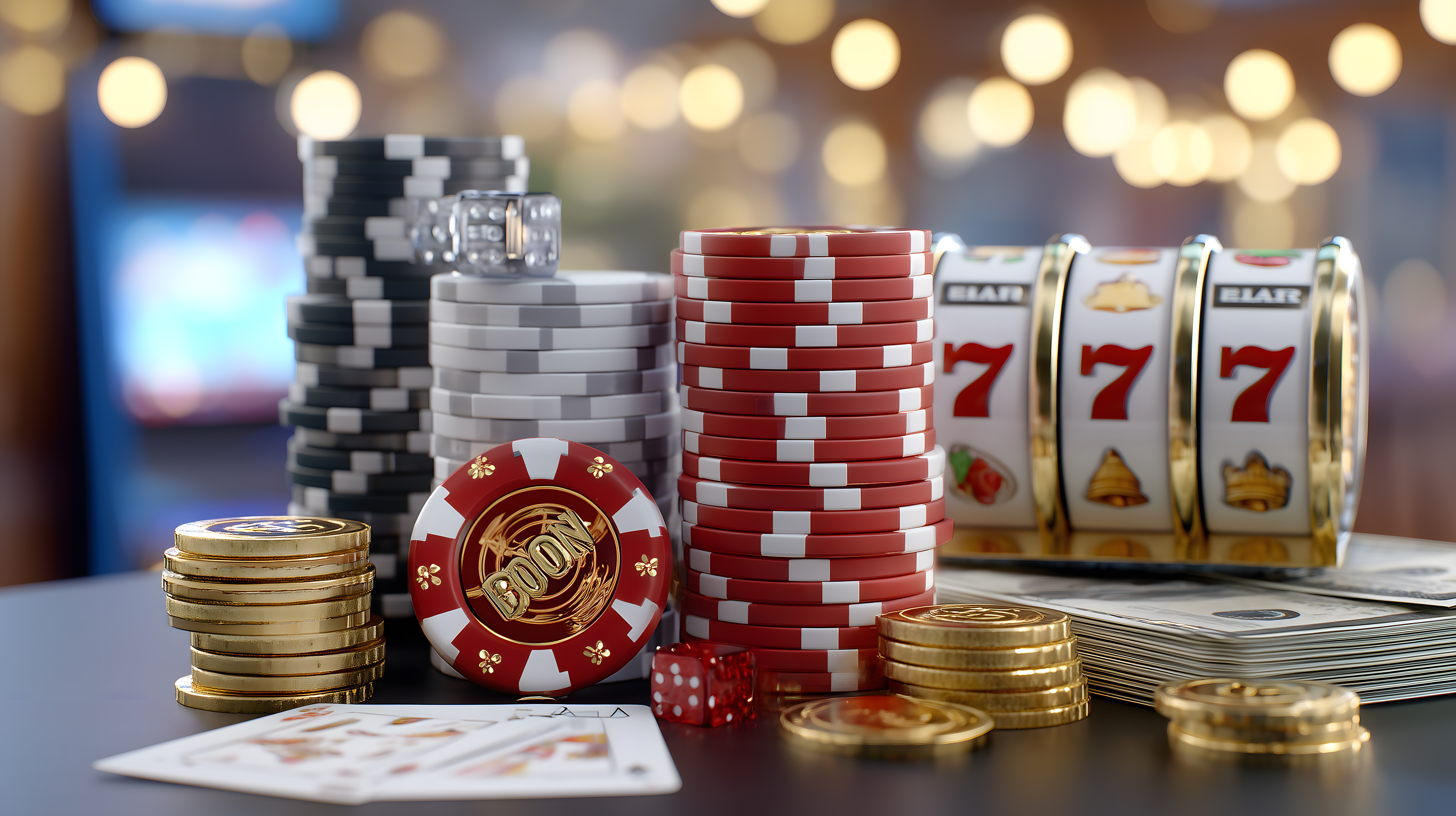 Das Bild zeigt einen Stapel bunter Spielchips, darunter goldene Gewinnchips, sowie Münzen und Spielautomaten-Symbole. Die Chips und Münzen sind vor einem unscharf leuchtenden Hintergrund mit Bokeh-Effekt platziert, was eine entspannte, feierliche Atmosphäre erzeugt. Dieses farbenfrohe Foto eignet sich gut für Beiträge zu Themen wie Glücksspiel, Freizeit und Unterhaltung, z.B. in Blogbeiträgen, Social-Media-Posts oder Werbematerialien. Das hochauflösende Foto ist unter einer Creative-Commons-Lizenz verfügbar und kann daher kostenfrei für verschiedene Projekte genutzt werden.
