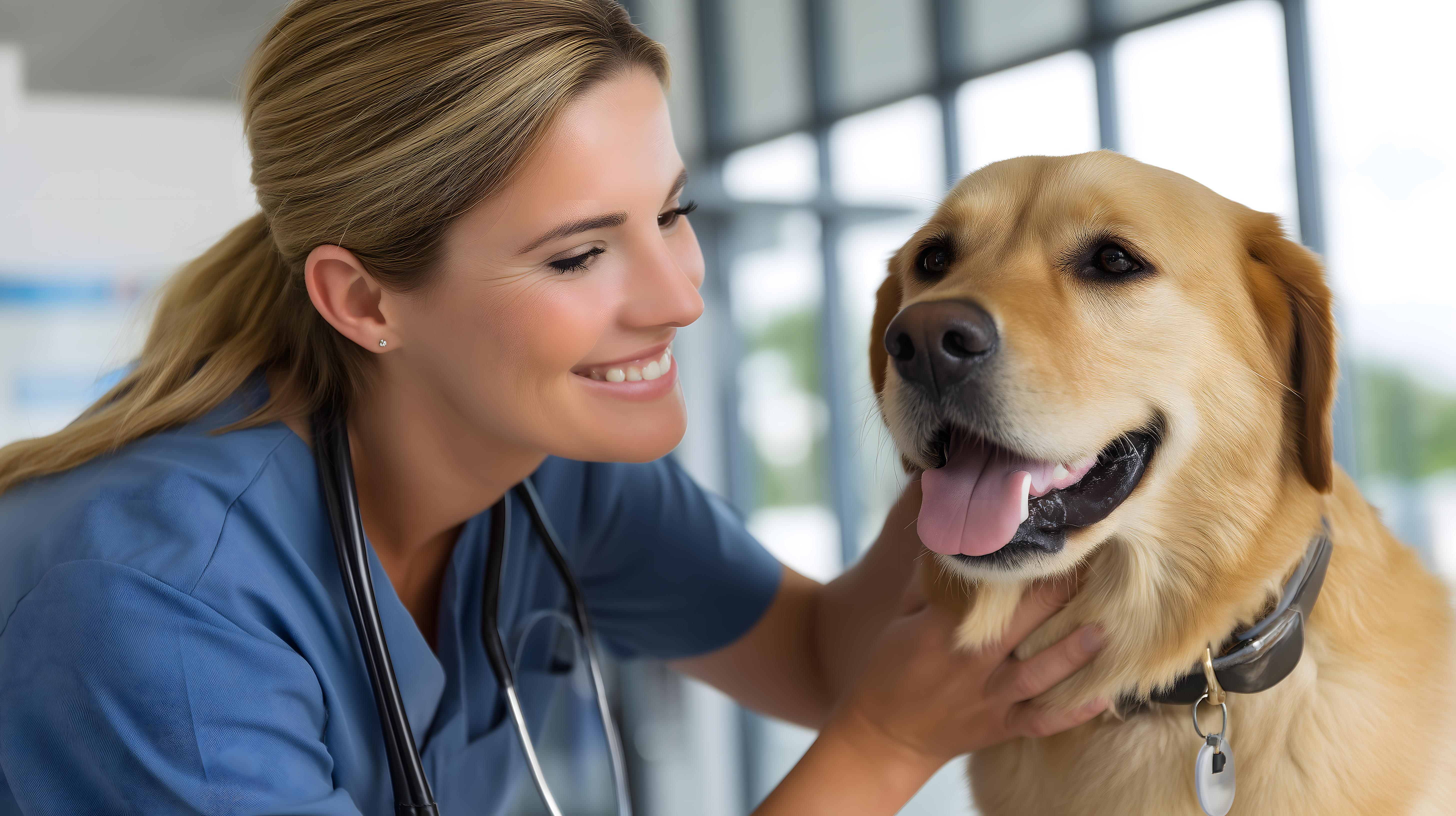 Das Bild zeigt eine lächelnde Tierärztin, die einen Golden Retriever in ihrer Praxis streichelt. Sie trägt eine blaue Schutzkitteluniform und einen Mundschutz, was auf ihre professionelle Rolle als Medizinerin hinweist. Der Hund scheint die Zuwendung und Fürsorge der Ärztin sichtlich zu genießen, was die vertrauensvolle Beziehung zwischen den beiden widerspiegelt.