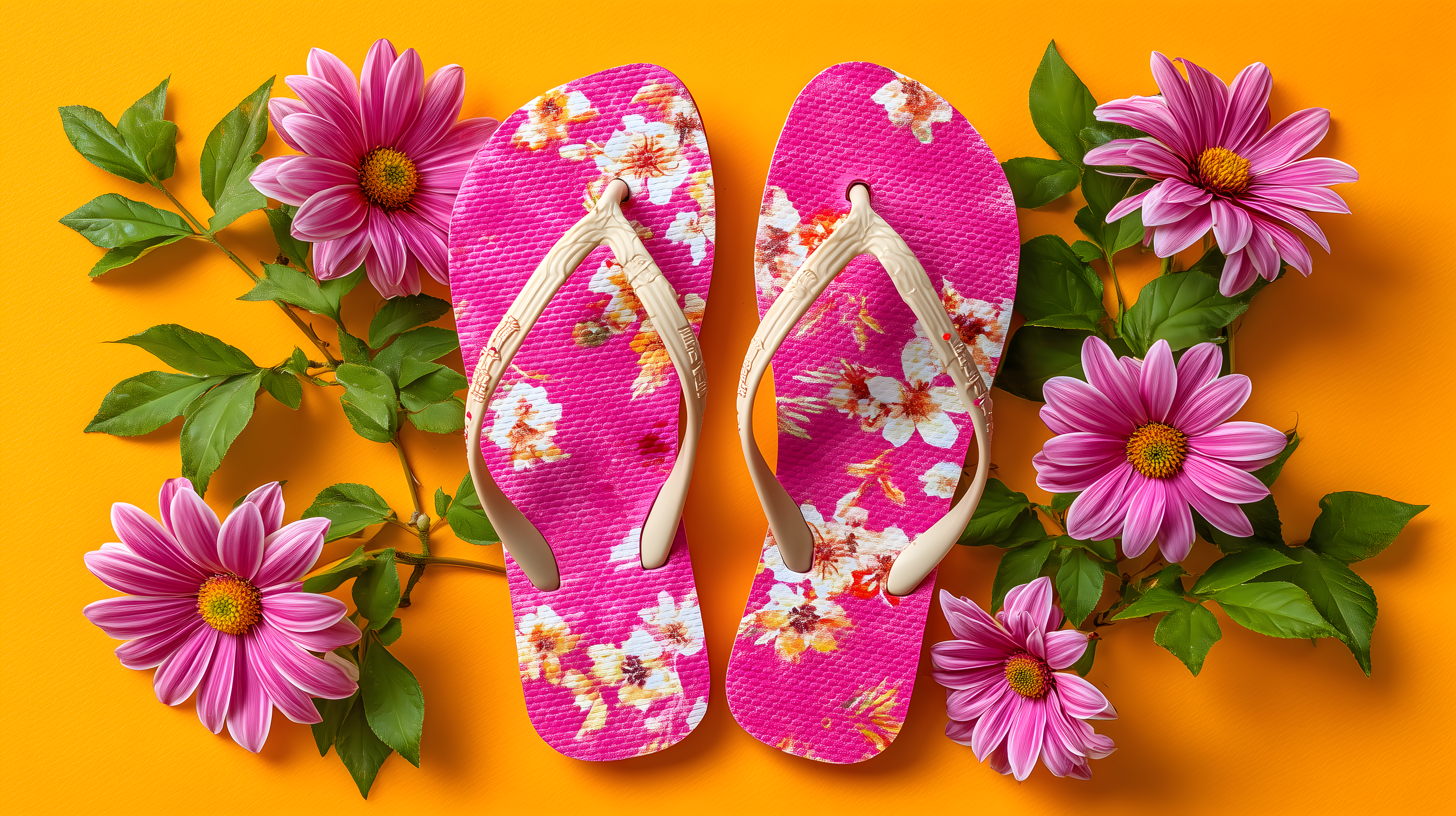 Dieses farbenfrohe Bild zeigt ein Paar auffallende Sommerschuhe mit einem floralen Blumenmuster auf einem leuchtend gelben Hintergrund. Die rosafarbenen Flip-Flops sind mit einem Muster aus rosa, roten und weißen Blüten verziert und werden von frischen grünen Blättern umrahmt. Die lebendige Komposition verleiht der Szene eine fröhliche, sommerliche Atmosphäre. Dieses Motiv eignet sich hervorragend für die Verwendung in Blogs, Newslettern, Social-Media-Beiträgen oder Werbematerialien zum Thema Sommer, Reisen, Gartendekor oder Einladungen. Dieses hochauflösende Stockfoto steht unter einer Creative-Commons-Lizenz kostenlos zur Verfügung.