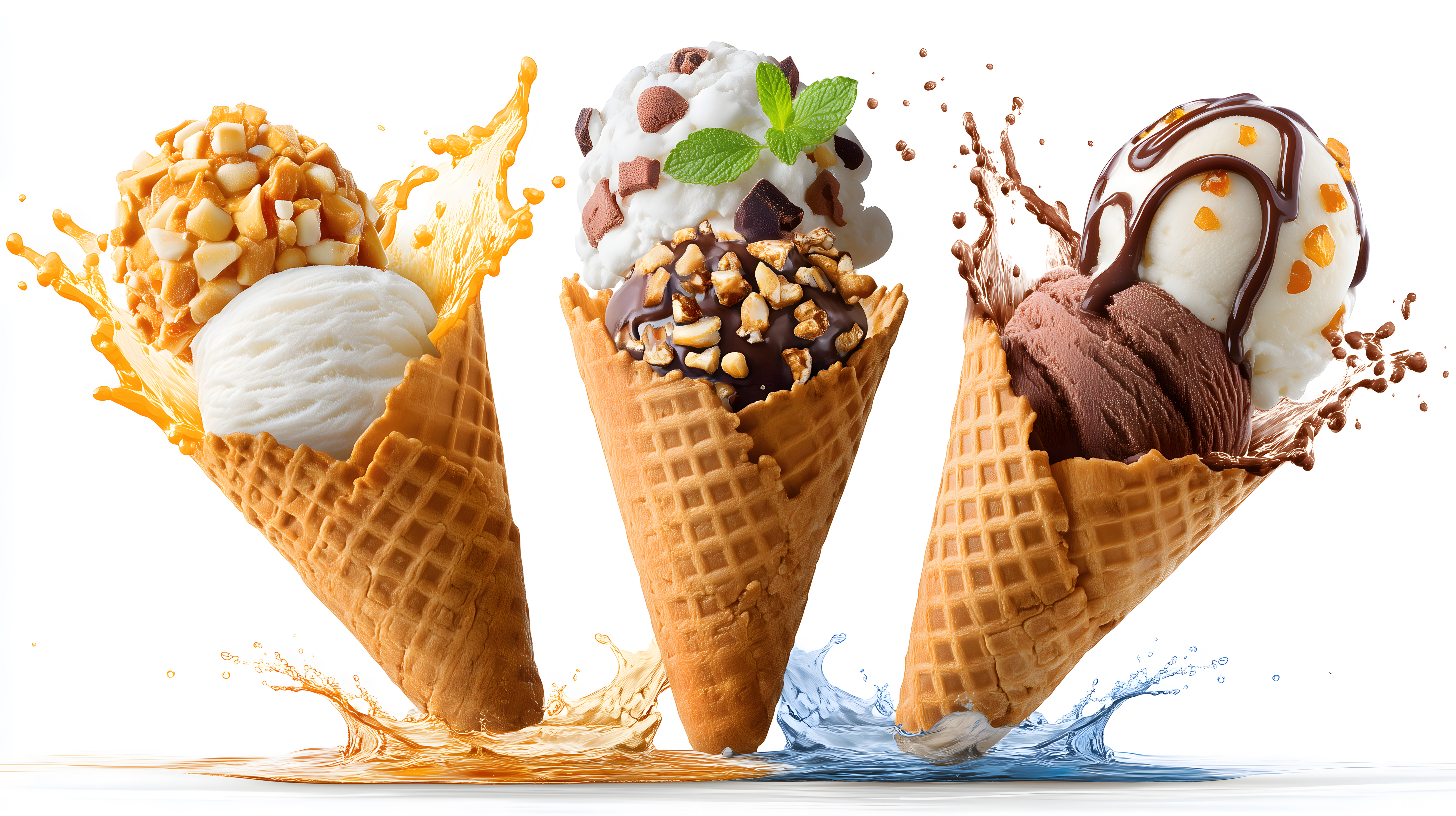 Das Bild zeigt drei köstliche Eiscremetüten mit unterschiedlichen Geschmacksrichtungen und Toppings. Im Vordergrund sind zwei Kegel mit Vanille- und Erdbeereis zu sehen, die durch Spritzer und Wassertropfen akzentuiert werden. Dahinter befindet sich eine Eistüte, die mit Schokolade, Nüssen und einer Minze-Dekoration verziert ist. Die Aufnahme besticht durch ihre satte Farbgebung, die realistische Darstellung und den appetitlichen Gesamteindruck. Dieses hochauflösende Stockfoto eignet sich hervorragend für Werbezwecke in Magazinen, Websites oder sozialen Medien rund um das Thema Speiseeis, Desserts und Leckereien. Es steht unter einer kostenlosen Creative-Commons-Lizenz zur Verfügung.