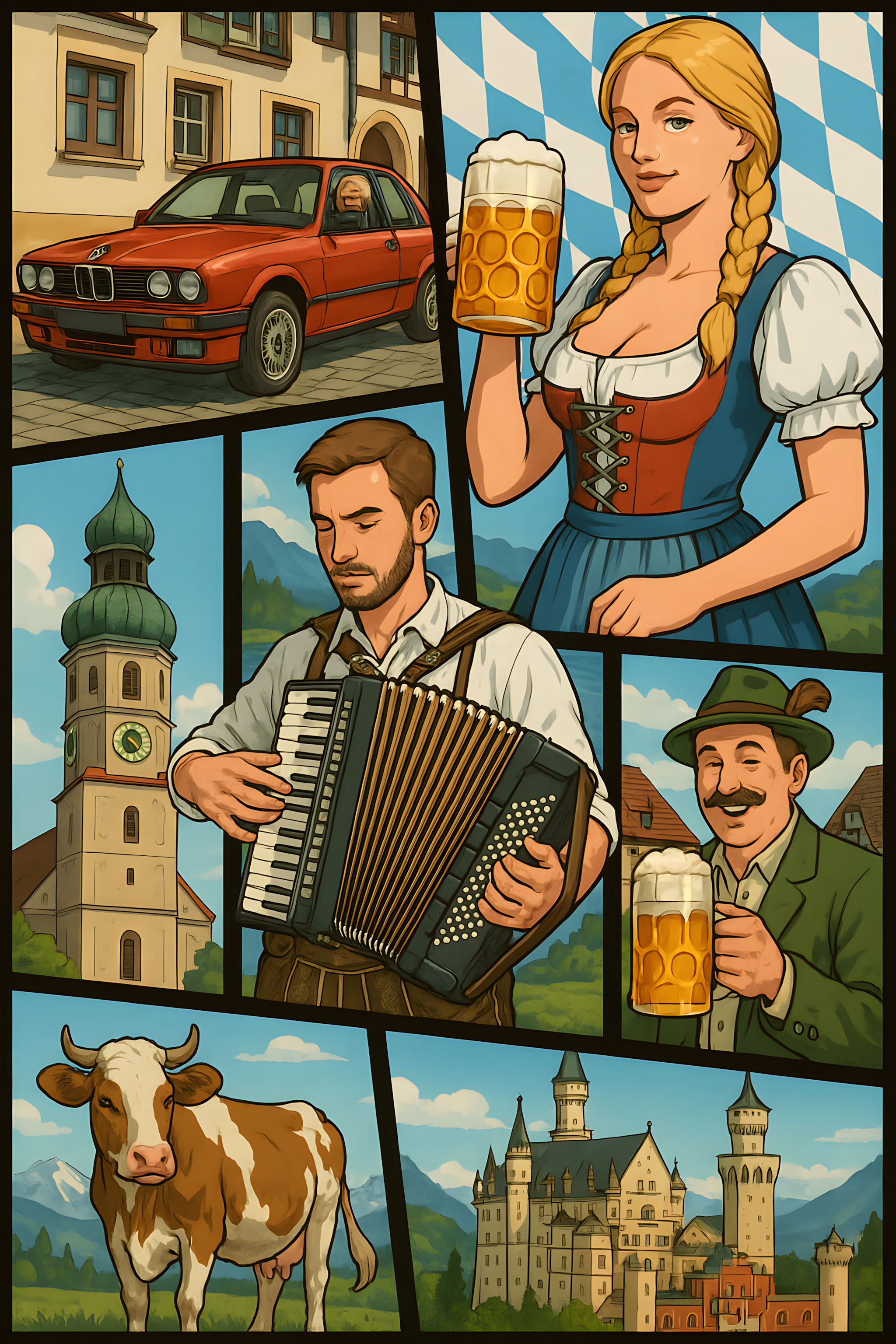 Diese farbenfrohe und detailreiche Illustration zeigt eine typische Szene aus dem bayrischen Alltag. Im Mittelpunkt steht eine junge Frau in traditioneller Dirndl-Tracht, die ein großes Bierglas in der Hand hält und fröhlich lächelt. Im Hintergrund sind weitere bayrische Elemente zu sehen: ein roter BMW, ein Mann mit Lederhose und Akkordeon sowie eine Kuh vor einer Berglandschaft mit historischen Gebäuden.