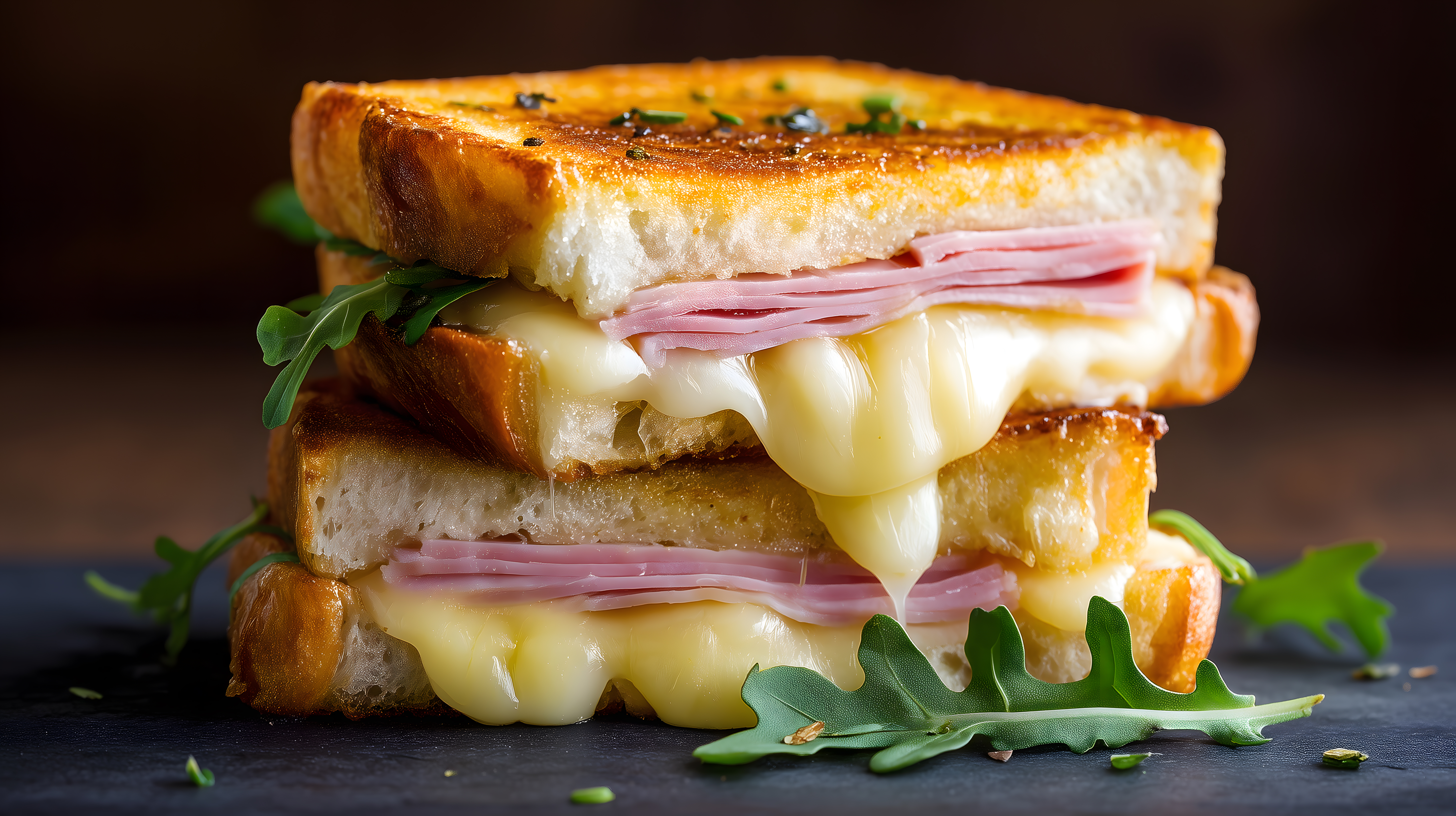 Das Bild zeigt ein leckeres Croque Monsieur-Sandwich, das auf einem dunklen Holzhintergrund platziert ist. Das Sandwich ist mit geschmolzenem Käse und Schinken gefüllt und mit frischem Rucola garniert. Die Perspektive des Fotos ist nah, so dass man die Textur des knusprigen, goldbraunen Brotes und die schmelzende Käsefüllung gut erkennen kann. Die Kombination der Farben Braun, Gelb und Grün schafft einen appetitlichen Kontrast. Dieses Foto eignet sich perfekt für die Verwendung in Blogs, Social Media-Posts oder Werbematerialien zum Thema leckere Mittagessen, Imbisse oder Cafe-Angebote. Es ist ein hochwertiges, kostenloses Stockfoto, das unter der Creative Commons-Lizenz veröffentlicht wurde.