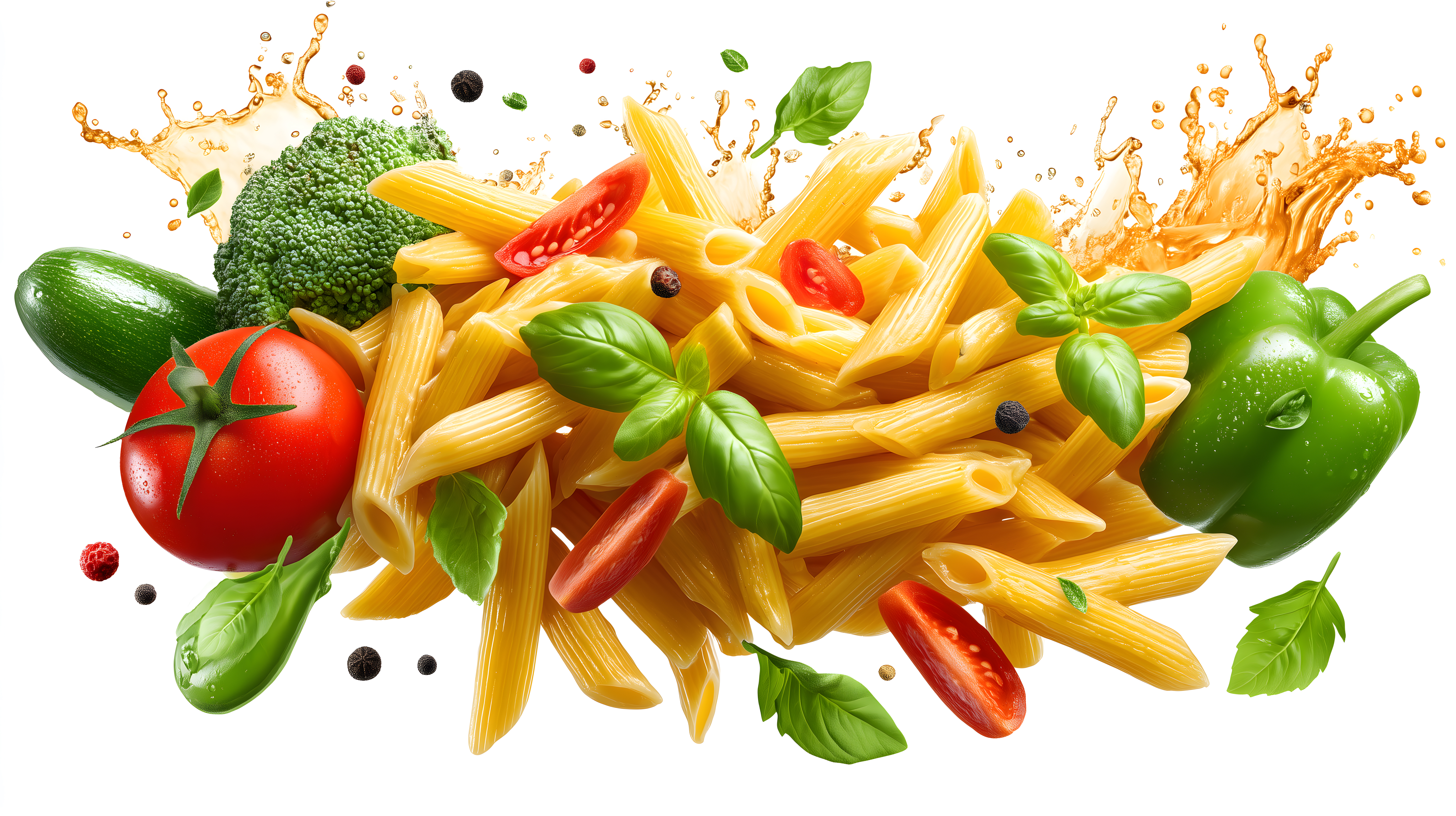 Dieses Stockfoto zeigt eine bunte Zusammenstellung aus frischem Gemüse wie Tomaten, Paprika und Brokkoli sowie Pasta in einer dynamischen Komposition. Die Lebensmittel sind vor einem weißen Hintergrund platziert, was einen klaren Fokus auf die Farben und Formen ermöglicht. Spritzer und Spritzer verleihen dem Bild einen lebendigen und appetitlichen Charakter. Dieses Foto eignet sich hervorragend für den Einsatz in Rezeptbüchern, Kochblogs, Werbematerialien für gesunde Ernährung oder Social-Media-Posts zum Thema Kochen und Kulinarik. Als kostenloses Stockfoto in hoher Auflösung und unter Creative-Commons-Lizenz ist es vielseitig einsetzbar.