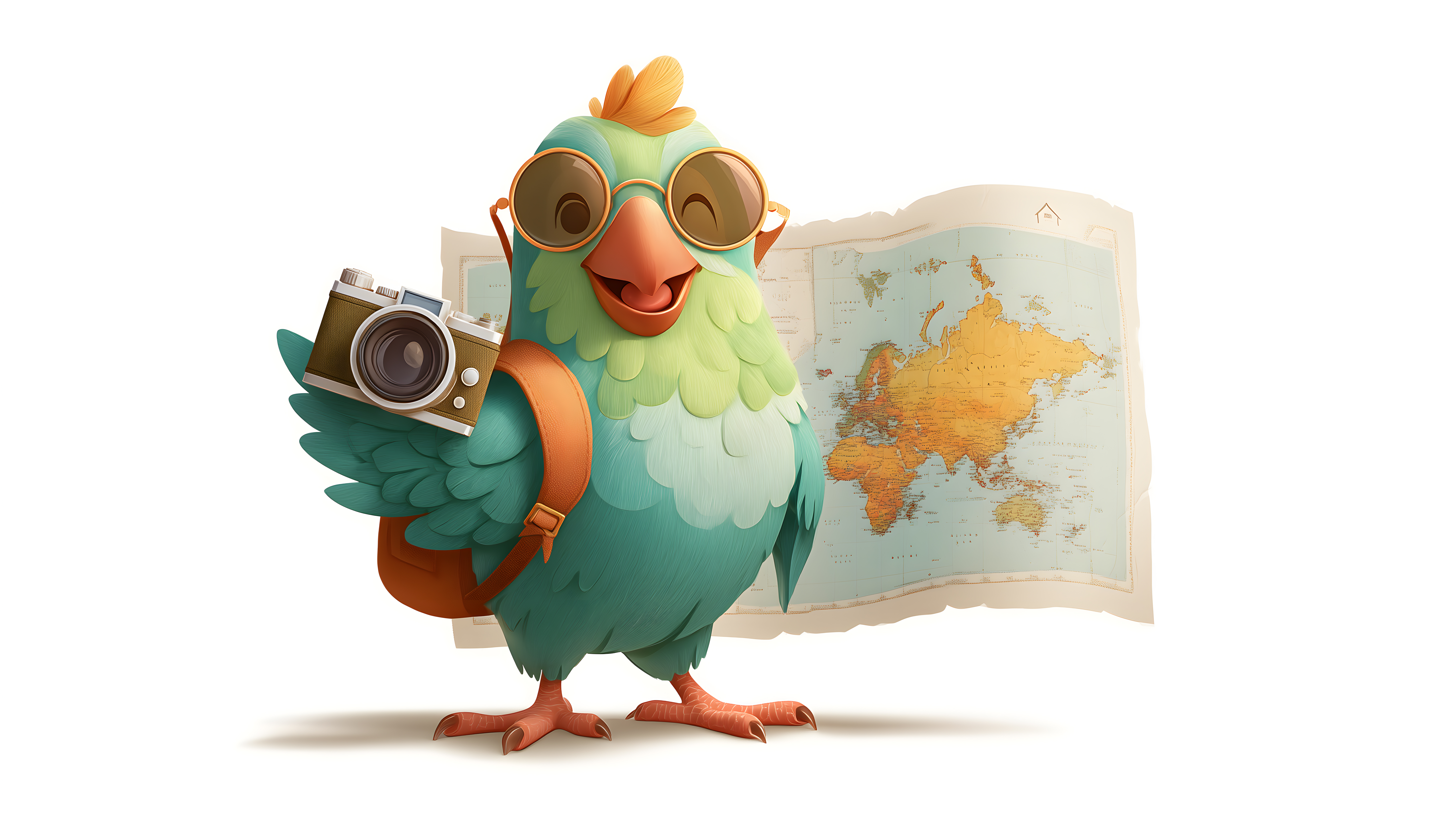 Das Bild zeigt einen fröhlichen, comic-artigen Papagei mit großen, runden Brillengläsern, der eine alte Weltkarte und eine Kamera in seinen Krallen hält. Der Papagei scheint als reisefreudiger Tourist dargestellt zu sein, bereit für neue Abenteuer und Entdeckungen. Die lebendige Farbgebung mit Nuancen von Grün, Orange und Gelb verleiht dem Motiv einen heiteren, charmanten Charakter.