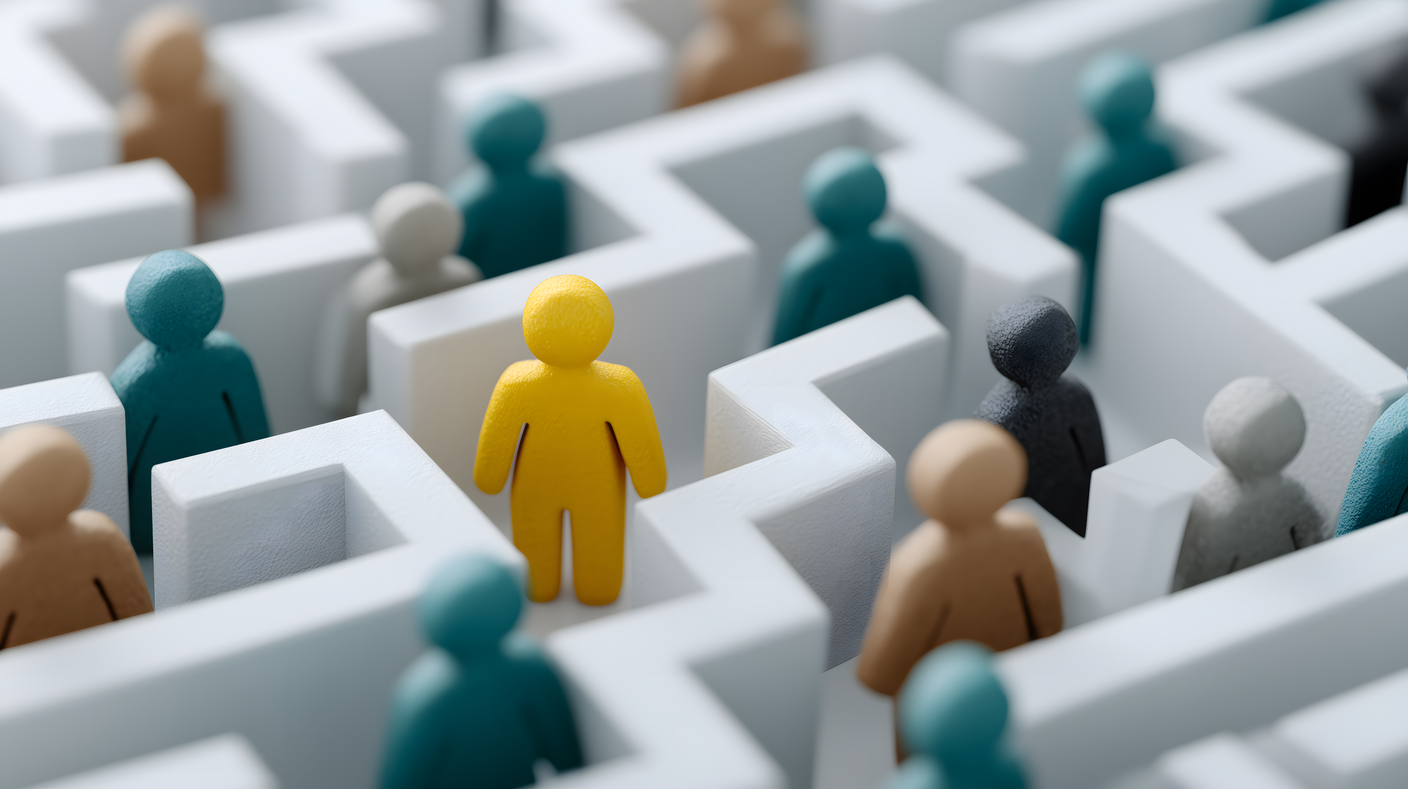 Diese abstrakte Illustration zeigt eine Gruppe von Charakteren in einem weißen, labyrinthartigen Umfeld. Die Charaktere sind in verschiedenen Farben und Formen dargestellt, was auf Individualität und Vielfalt hindeutet. Die Perspektive aus der Vogelperspektive verleiht dem Bild eine strategische und konzeptionelle Anmutung, die sich beispielsweise für Themen wie Teambuilding, Führung oder Herausforderungen eignet.