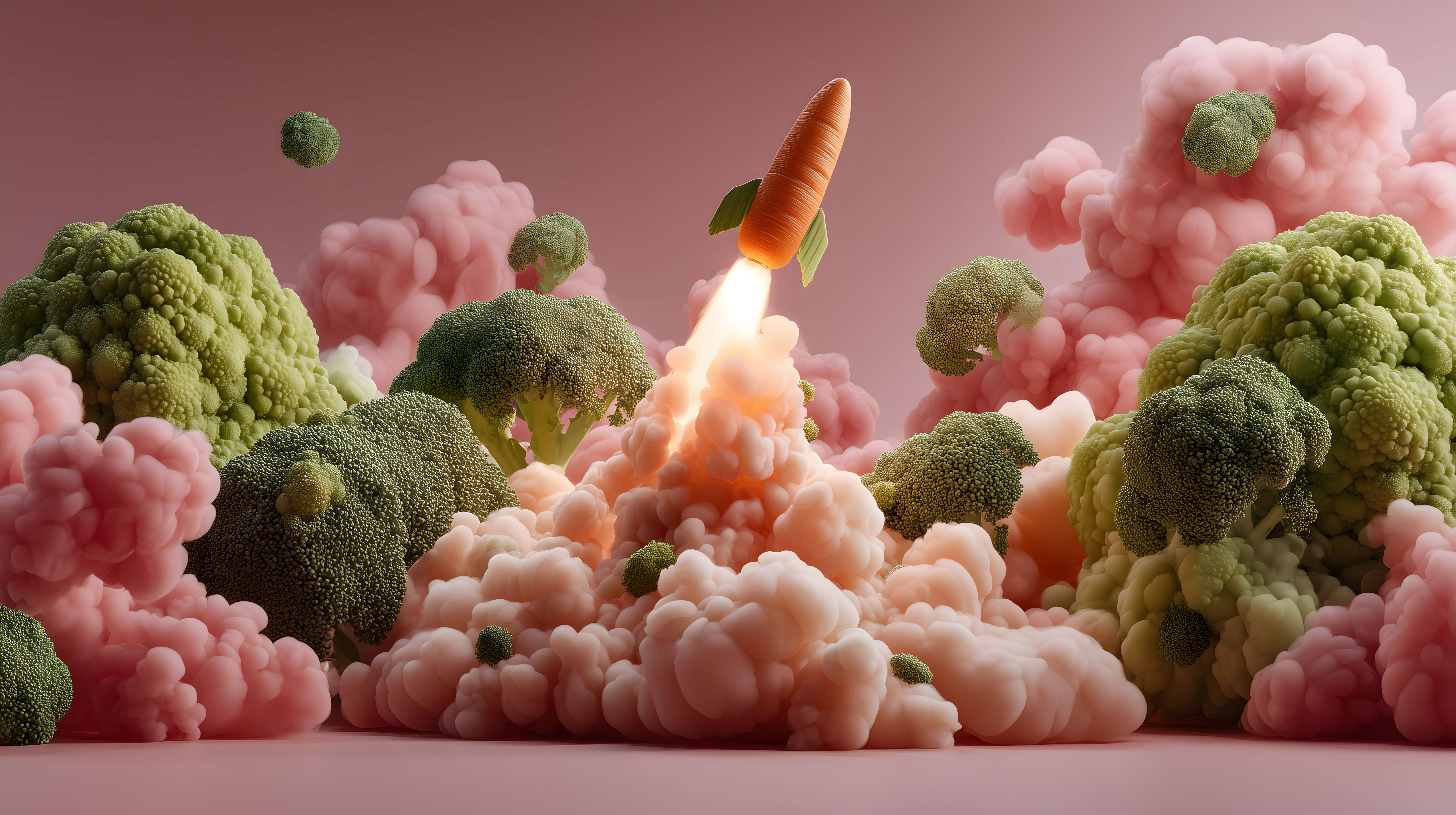 Das farbenfrohe digitale Foto zeigt eine fantasievolle Szene, in der eine Karotten-Rakete zwischen Brokkoli-Bergen und rosa Rauchschwaden startet. Die Komposition ist surreal und verspielt, mit detaillierten, hochaufgelösten Oberflächen der Gemüsestücke, die eine lebendige und realistische Ästhetik verleihen. Dieses kreative und einzigartige Stockfoto eignet sich hervorragend für den Einsatz in Blogbeiträgen, Newsletter-Designs, Social-Media-Kampagnen oder Werbematerialien, die ein fantasievolles und natürliches Motiv suchen. Es ist unter einer Creative-Commons-Lizenz kostenfrei für kommerzielle und private Zwecke verfügbar.
