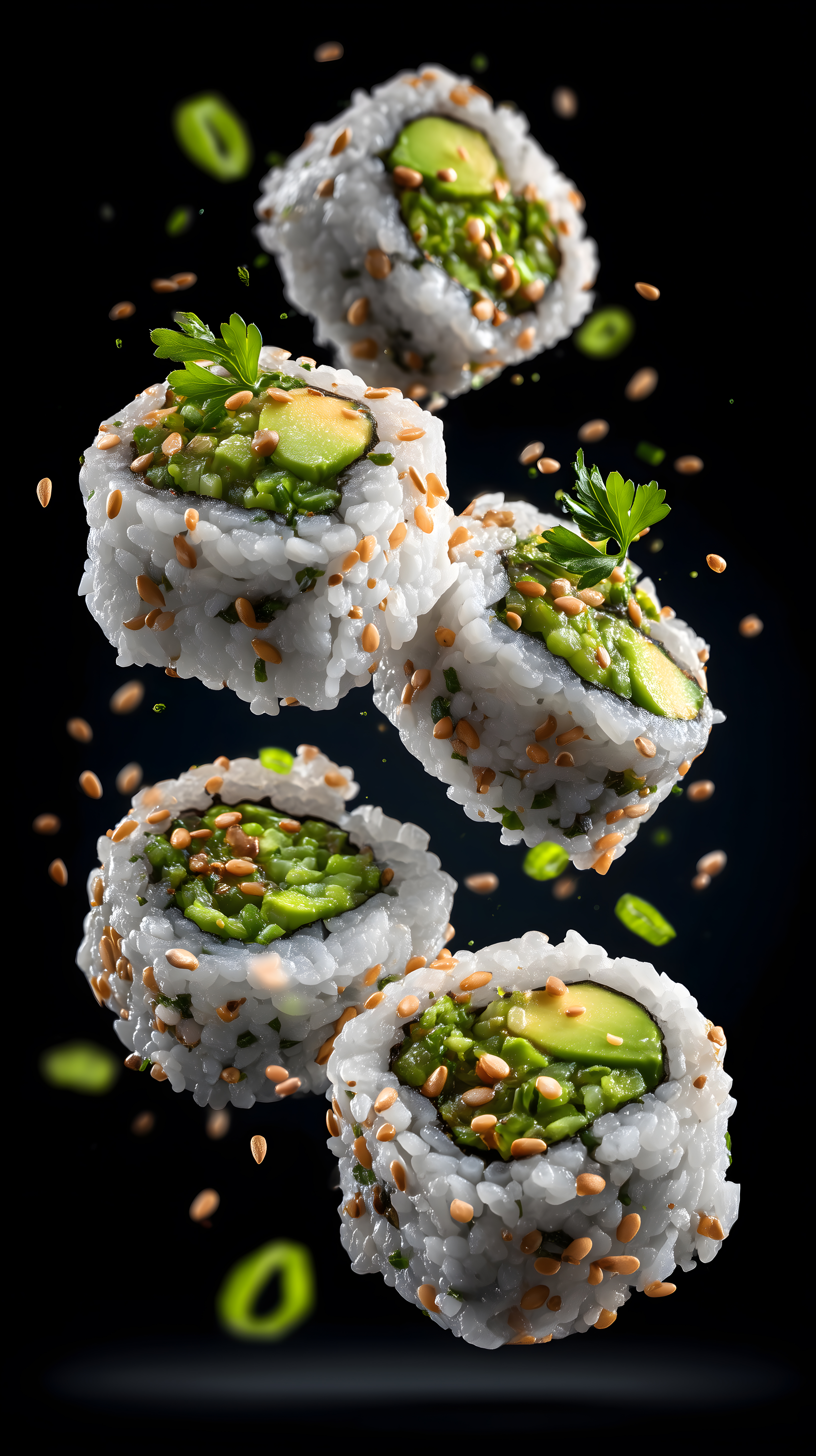 Dieses hochwertige Stockfoto zeigt eine Nahaufnahme von luftig leichten, vegetarischen Sushirollen, die mit grünen Erbsen, Avocado-Scheiben und Sesam garniert sind. Die Rollen wurden vor einem dunklen Hintergrund fotografiert, wodurch die knalligen Farben und natürlichen Zutaten besonders gut zur Geltung kommen. Dieses Bild eignet sich hervorragend für die Verwendung in Blogs, Newslettern oder sozialen Medien rund um die Themen vegane und gesunde Ernährung, japanische Küche oder Foodfotografie. Als kostenloses Stockfoto in hoher Auflösung unter Creative-Commons-Lizenz kann es frei genutzt werden.