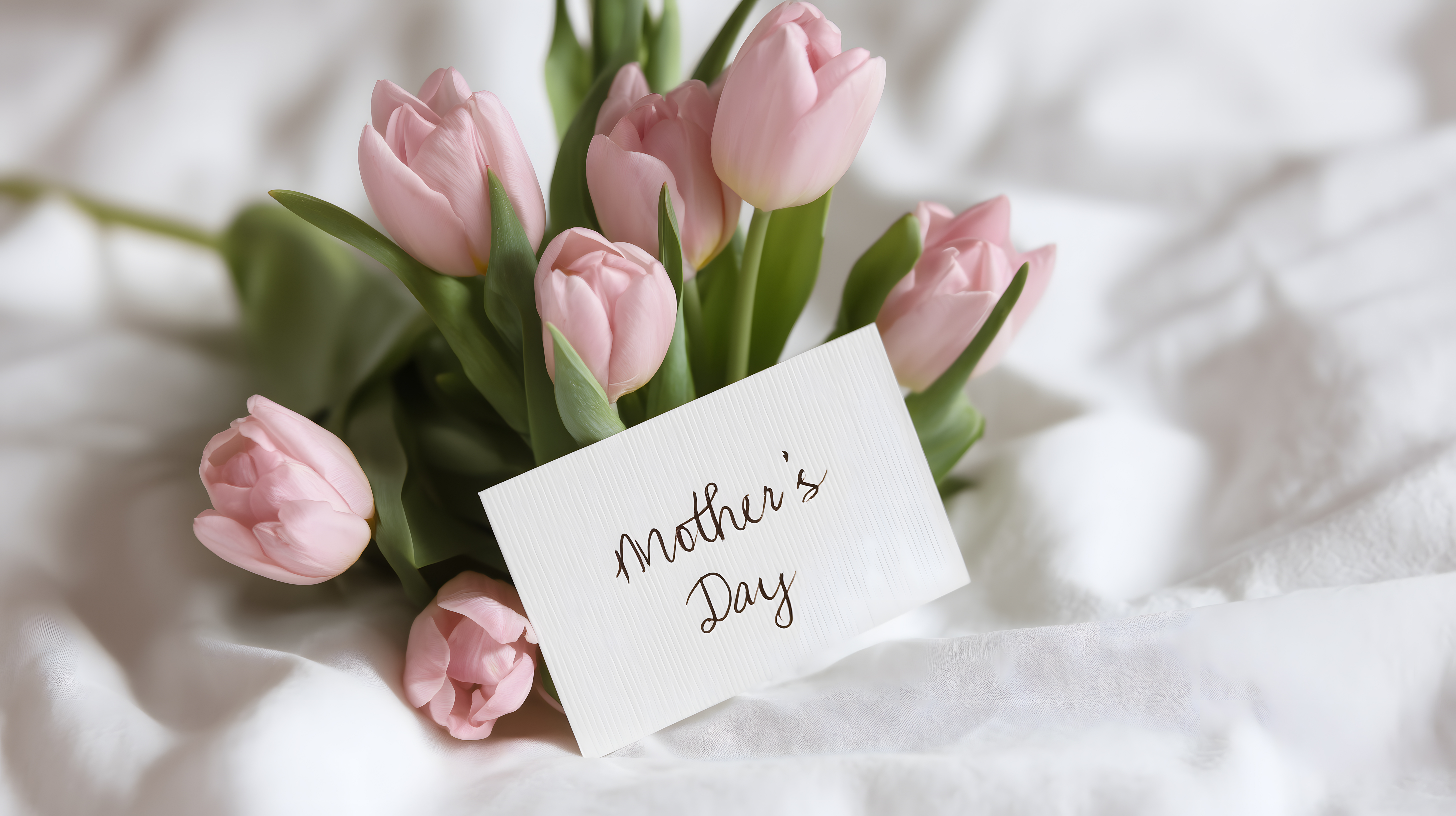 Dieses Foto zeigt einen üppigen Strauß mit zart rosafarbenen Tulpen, der auf einer weichen, weißen Bettdecke platziert ist. Eine liebevoll gestaltete Muttertagskarte liegt zwischen den Blumen, um die besondere Gelegenheit zu unterstreichen. Die Tulpen stehen in voller Blüte und verbreiten einen frischen, frühlingshaften Duft. Das Arrangement wirkt romantisch und einladend, ideal als Hintergrundbild für Grußkarten, Einladungen oder Social-Media-Posts rund um den Muttertag. Dieses hochauflösende Stockfoto steht unter einer Creative-Commons-Lizenz zur kostenlosen Verwendung zur Verfügung.