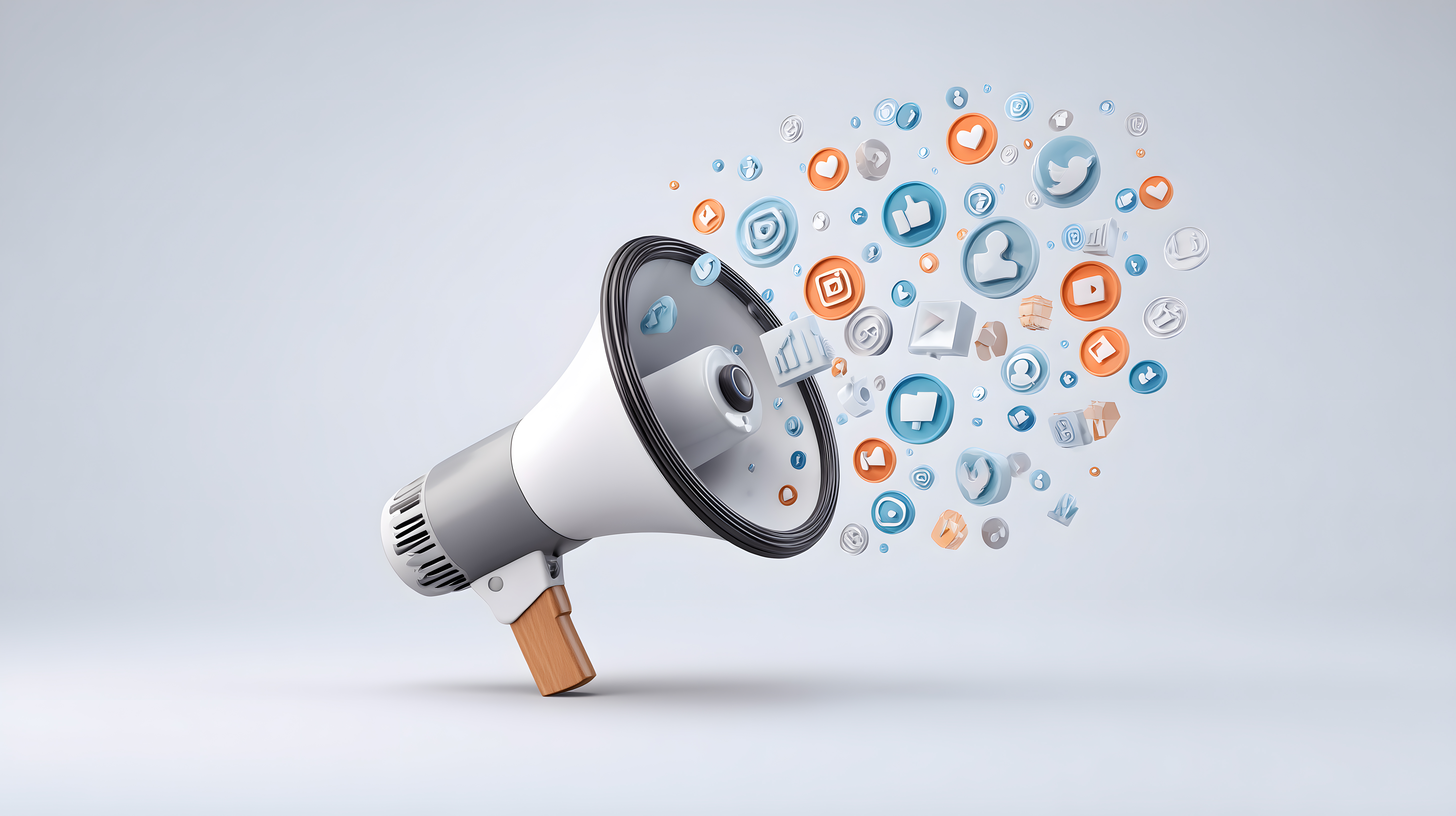 Dieses Bild zeigt ein digitales Megafon, das als Symbol für Online-Marketing und Social-Media-Kommunikation dient. Um das Megafon herum sind verschiedene Social-Media-Symbole und Interaktions-Elemente wie Likes, Kommentare und Shares angeordnet. Die Farbpalette in Blau-, Grau- und Orangetönen verleiht dem Bild einen modernen und digitalen Charakter. Dieses Stockfoto eignet sich hervorragend für Blogbeiträge, Newsletter-Designs, Social-Media-Grafiken und Werbematerialien in den Bereichen Digital Marketing, Influencer-Marketing und Social-Media-Strategie. Das Bild ist in hoher Auflösung und unter einer Creative-Commons-Lizenz frei verwendbar.