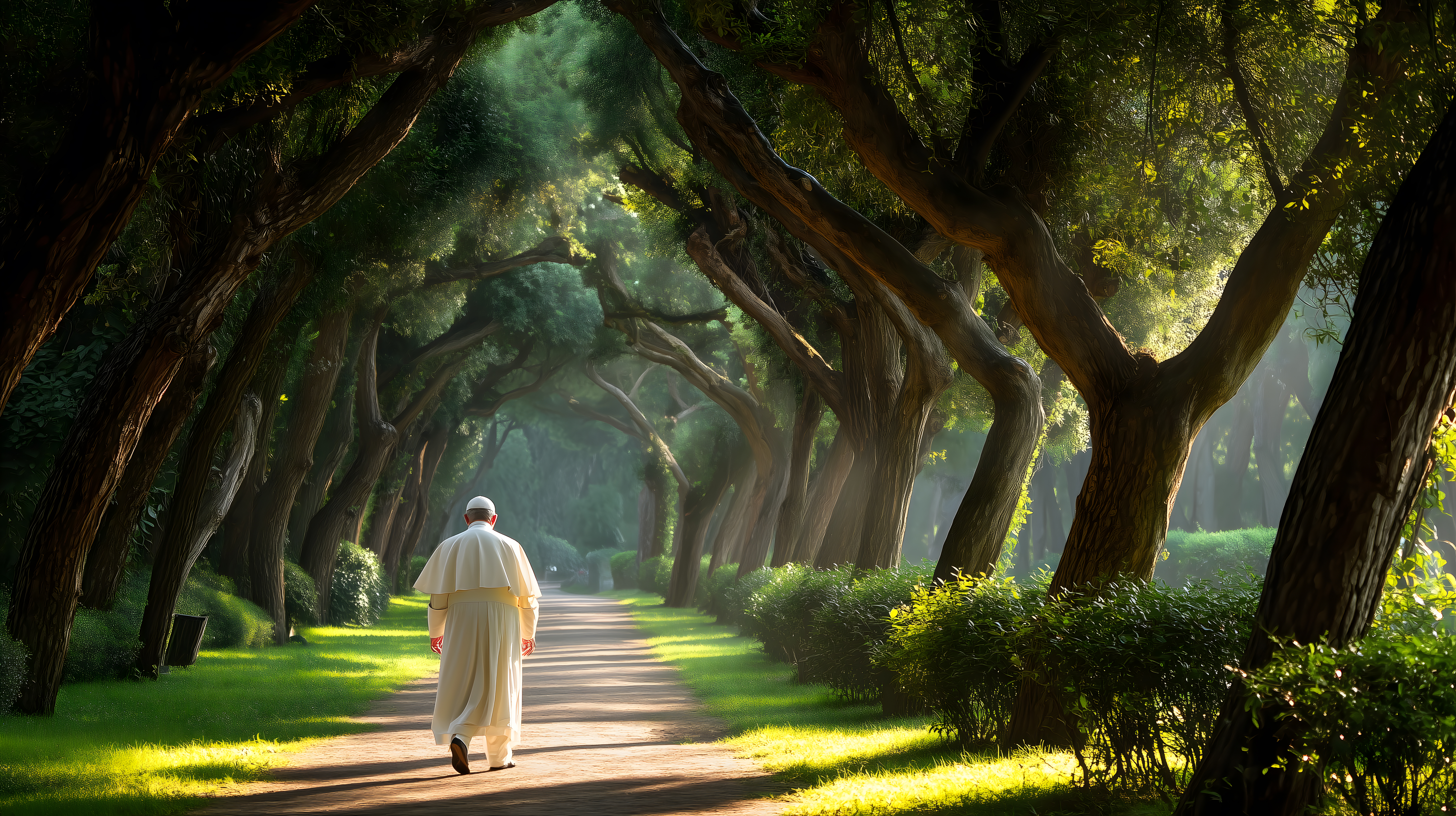 Dieses faszinierende Foto zeigt einen Mann in einer weißen Kutte, der alleine einen schmalen Weg durch einen dichten, mystischen Baumkorridor entlanggeht. Die hohen, gewundenen Äste der Bäume bilden ein natürliches Gewölbe über dem Pfad und lassen ein gedämpftes, grünes Licht auf den Wandernden fallen. Die Stimmung ist friedvoll und kontemplativ, als würde der Mann hier seine Gedanken ordnen und zur Ruhe kommen. Dieses stimmungsvolle Bild eignet sich hervorragend für Blogs, Newsletter oder Social-Media-Posts, die eine spirituelle, naturverbundene Atmosphäre vermitteln wollen. Als kostenloses Stockfoto in hoher Auflösung und unter Creative-Commons-Lizenz kann es frei verwendet werden.