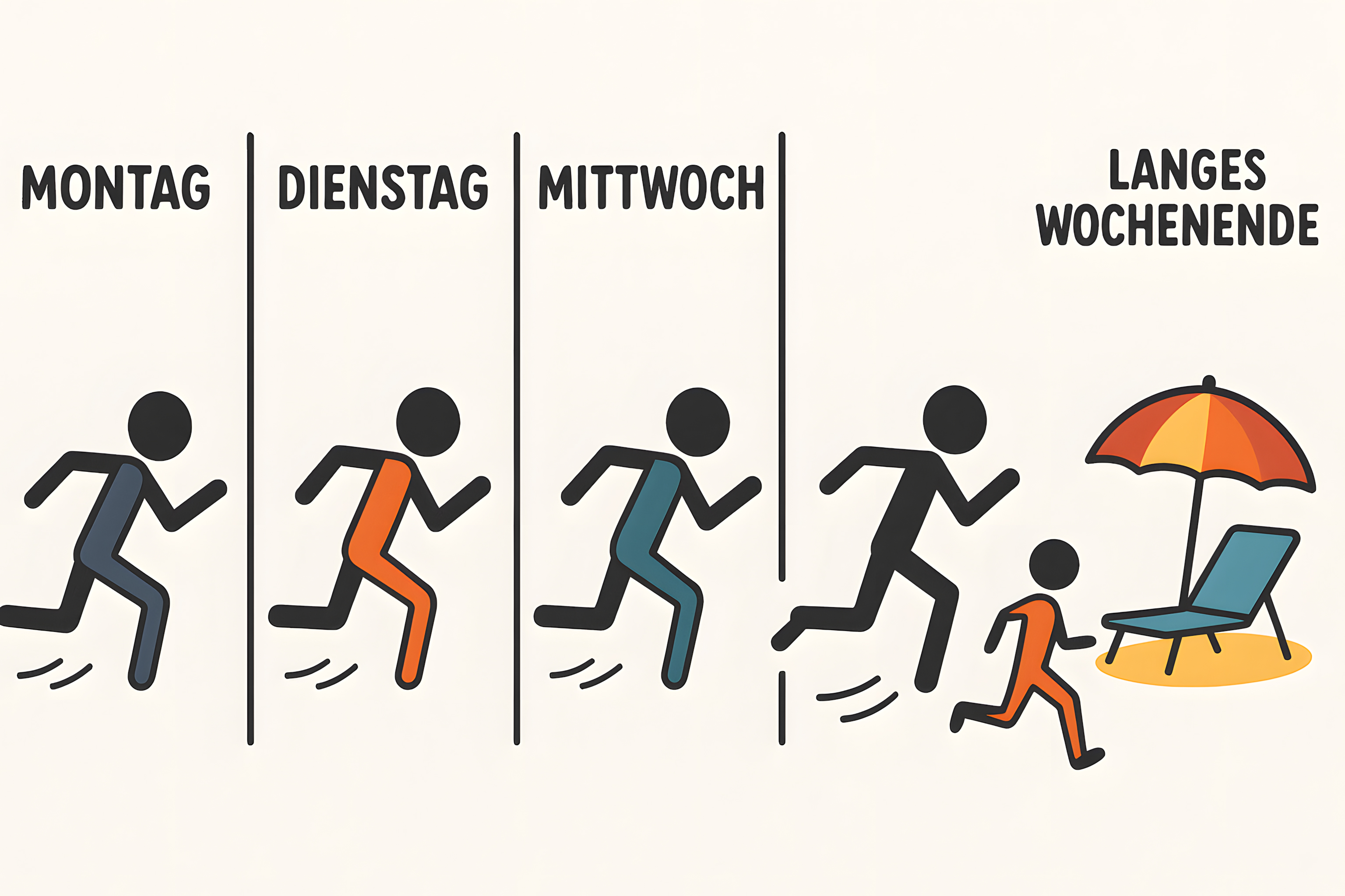 Dieses Symbolbild zeigt in einem minimalistischen Flach-Design, wie sich die Angestellten während der Woche zunehmend auf das Wochenende freuen. Die Piktogramme der Personen werden von Montag bis Mittwoch immer schneller und dynamischer, bis hin zur Erholung am Wochenende mit Sonnenschirm und Liegestuhl. Das Foto ist als kostenloses Stockfoto in hoher Auflösung unter einer Creative-Commons-Lizenz verfügbar und eignet sich für die Verwendung in Blogs, Newslettern, Social-Media-Beiträgen oder Werbematerialien zum Thema Arbeit, Freizeit und Work-Life-Balance.