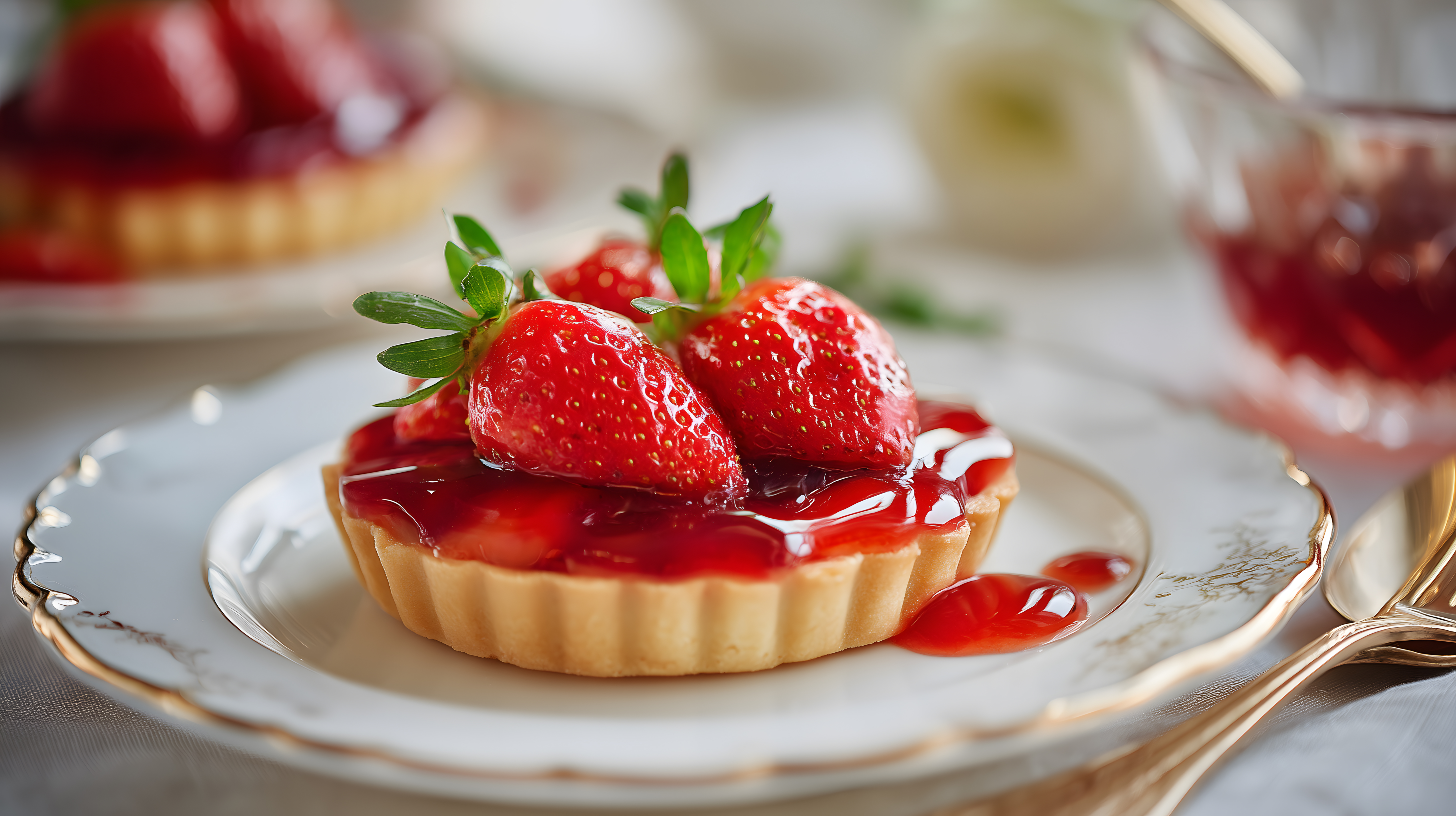 Dieses verlockende Foto zeigt ein mundwässrig-frisches Erdbeer-Törtchen auf einem eleganten Porzellan-Teller. Die saftigen, rot glänzenden Erdbeeren sind liebevoll auf einem knusprigen Mürbeteigboden angerichtet und mit einer transparenten, glänzenden Gelee-Glasur überzogen. Die Komposition besticht durch ihre stimmige Farbgebung in warmen Rot- und Goldtönen sowie die sorgfältige Anordnung der Zutaten. Dieses hochwertige Stockfoto eignet sich hervorragend für Rezepte, Backblogs, Food-Werbung und vieles mehr. Es ist in hoher Auflösung und unter einer Creative-Commons-Lizenz frei für kommerzielle und private Zwecke nutzbar.