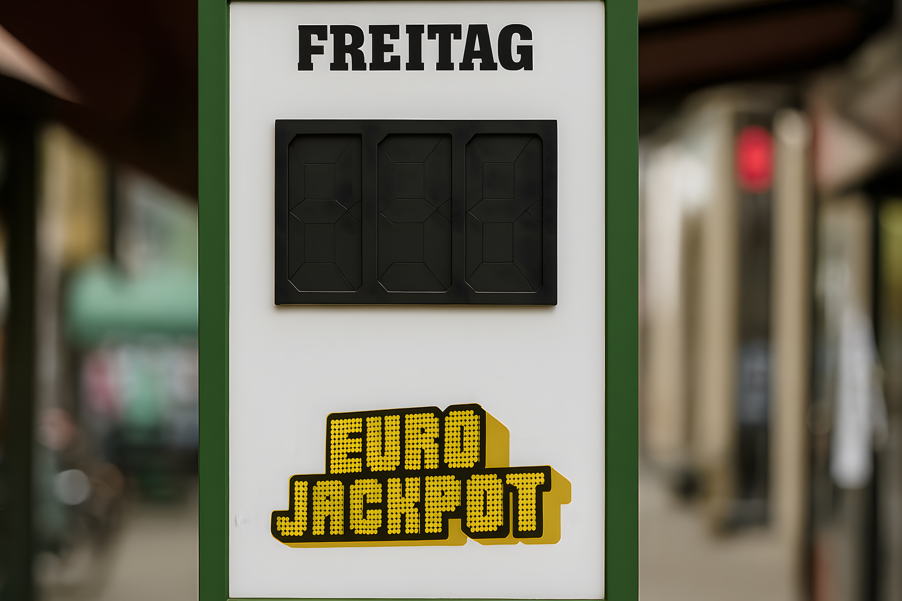 Das Bild zeigt einen Eurojackpot-Automaten in einem Geschäft in der Innenstadt. Der Automat ist in einem grünen Rahmen montiert und hat drei schwarze Felder, die möglicherweise zum Auswählen der Lottozahlen dienen. Darüber befindet sich der gelbe Schriftzug 'EUROJACKPOT'. Das Foto vermittelt die Atmosphäre eines Freitagabends, wenn Menschen versuchen, ihren Glücksstreif zu finden und den Jackpot zu knacken. Dieses kostenlose Stockfoto in hoher Auflösung unter Creative-Commons-Lizenz könnte ideal für Blog-Beiträge, Newsletter oder Social-Media-Kanäle rund um das Thema Lotterie und Glücksspiel geeignet sein.