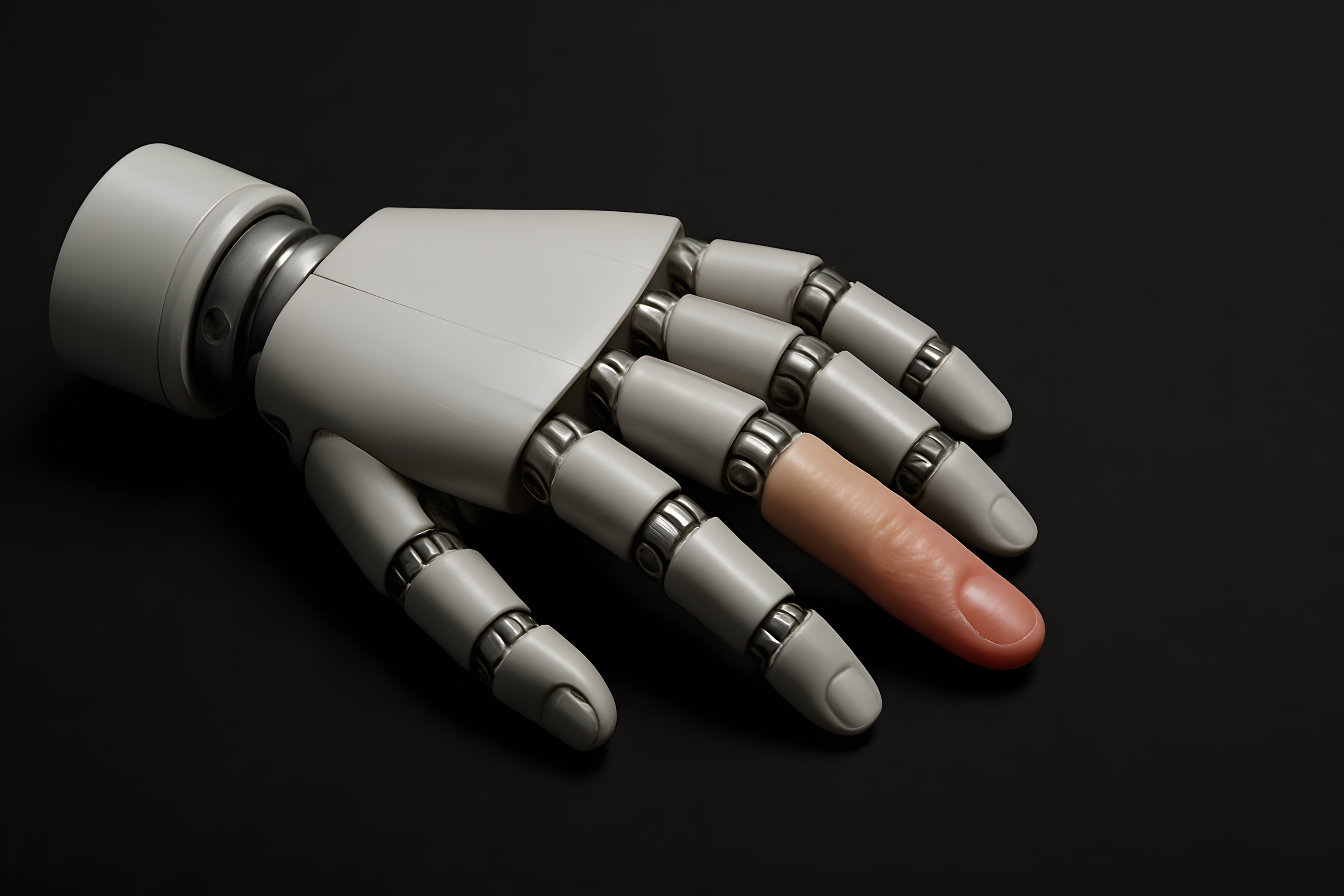 Dieses Foto zeigt eine futuristische Roboterhand mit einem einzelnen menschlichen Finger in der Mitte. Die Szene vermittelt das Konzept der Mensch-Maschine-Interaktion und der Verschmelzung von Technologie und Natur. Die Roboterhand ist in einem klaren, reduzierten Design gehalten, wodurch der Fokus auf den auffallenden menschlichen Finger gelenkt wird. Das Bild kann für verschiedene Anwendungen wie Blogbeiträge, Social-Media-Posts oder Werbekampagnen zum Thema Technologie, Innovation und Zukunft genutzt werden. Als kostenloses Stockfoto in hoher Auflösung und unter einer Creative-Commons-Lizenz ist es für viele Projekte geeignet.