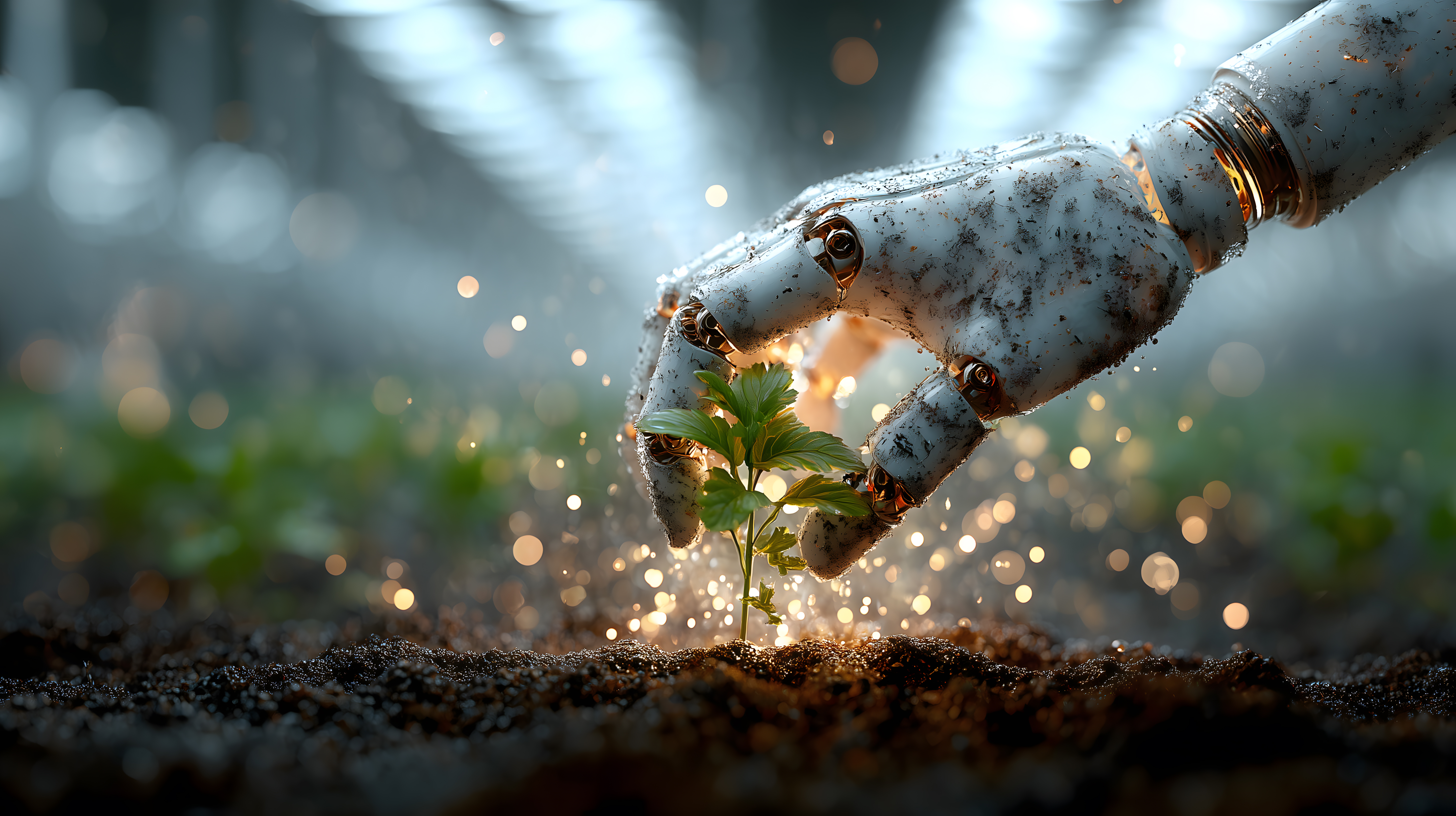 Das Bild zeigt eine Roboterhand, die eine zarte, grüne Pflanze aus der Erde wachsen lässt. Die Szene ist von einem weichen, verschwommenen Hintergrund umgeben, der durch funkelnde Lichtreflexe und einen leichten Nebelschleier charakterisiert ist. Durch die Kombination von Technologie und Natur vermittelt das Bild einen Eindruck von Innovation, Kreativität und Nachhaltigkeit. Es eignet sich hervorragend als kostenloses Stockfoto für Blogs, Newsletter, Social-Media-Kanäle oder Werbematerialien in den Bereichen Umweltschutz, Ökologie, Gartenbau oder Technologie. Das hochauflösende Bild steht unter einer Creative-Commons-Lizenz zur Verfügung.