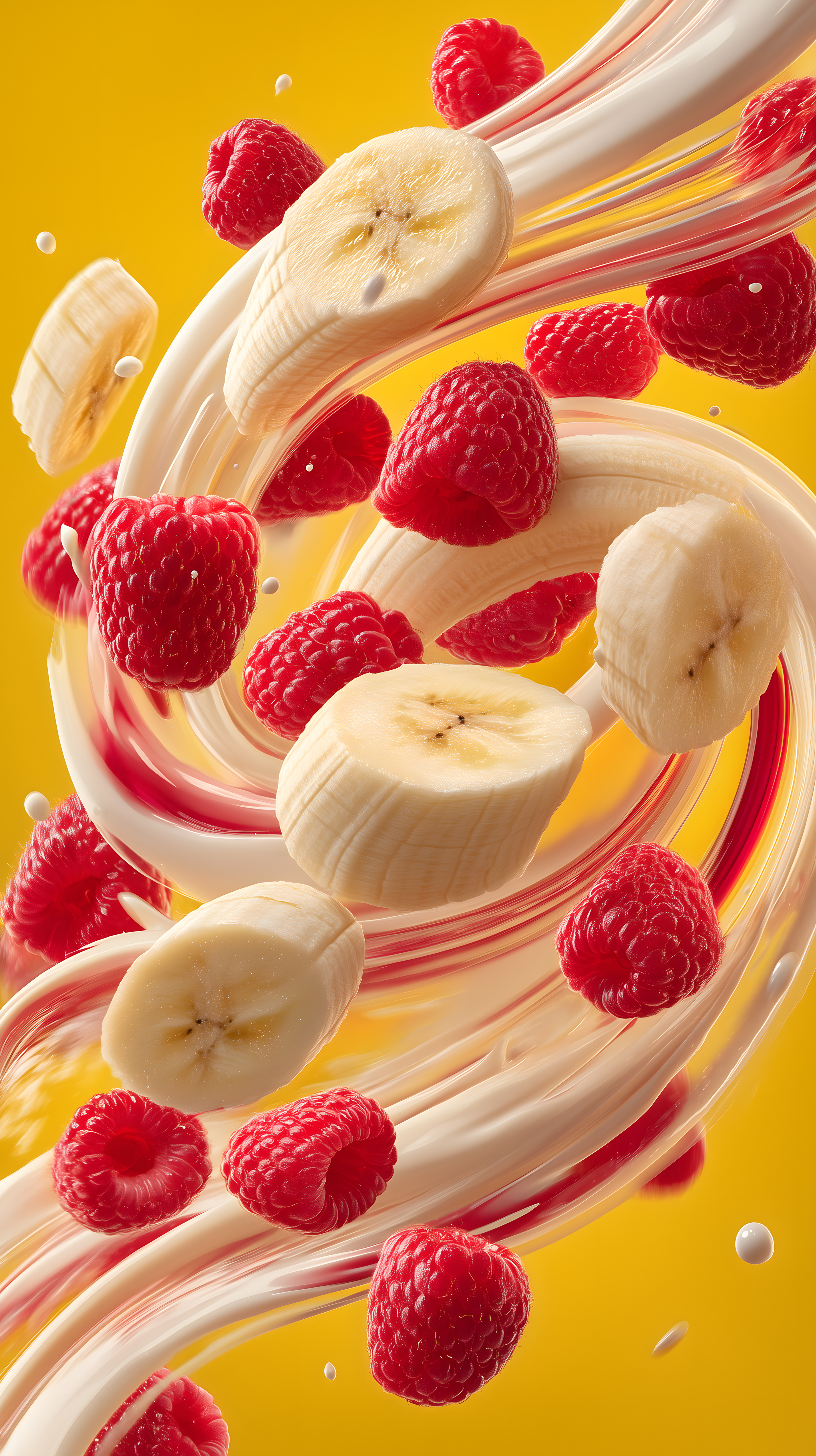 Dieses dynamische Foto zeigt eine Mischung aus verschiedenen Früchten, die in einem cremigen, strukturierten Joghurt oder einer ähnlichen Flüssigkeit schweben. Bananen- und Himbeerenscheiben wirbeln durch die Luft, umgeben von zarten Schleieren und Spritzern der milchigen Grundlage. Die Farbpalette reicht von kräftigem Rot der Himbeeren bis hin zum leuchtenden Gelb der Bananenscheiben, die sich vor dem intensiven Orangegelb des Hintergrunds perfekt abheben. Das Bild vermittelt einen frischen, fruchtigen und gesunden Eindruck und eignet sich hervorragend als Foto für Lebensmittelblogs, Dessertrezepte oder als Werbemotiv für Smoothies und Joghurtprodukte. Dieses hochauflösende, kostenlose Stockfoto steht unter einer Creative-Commons-Lizenz zur Verfügung.