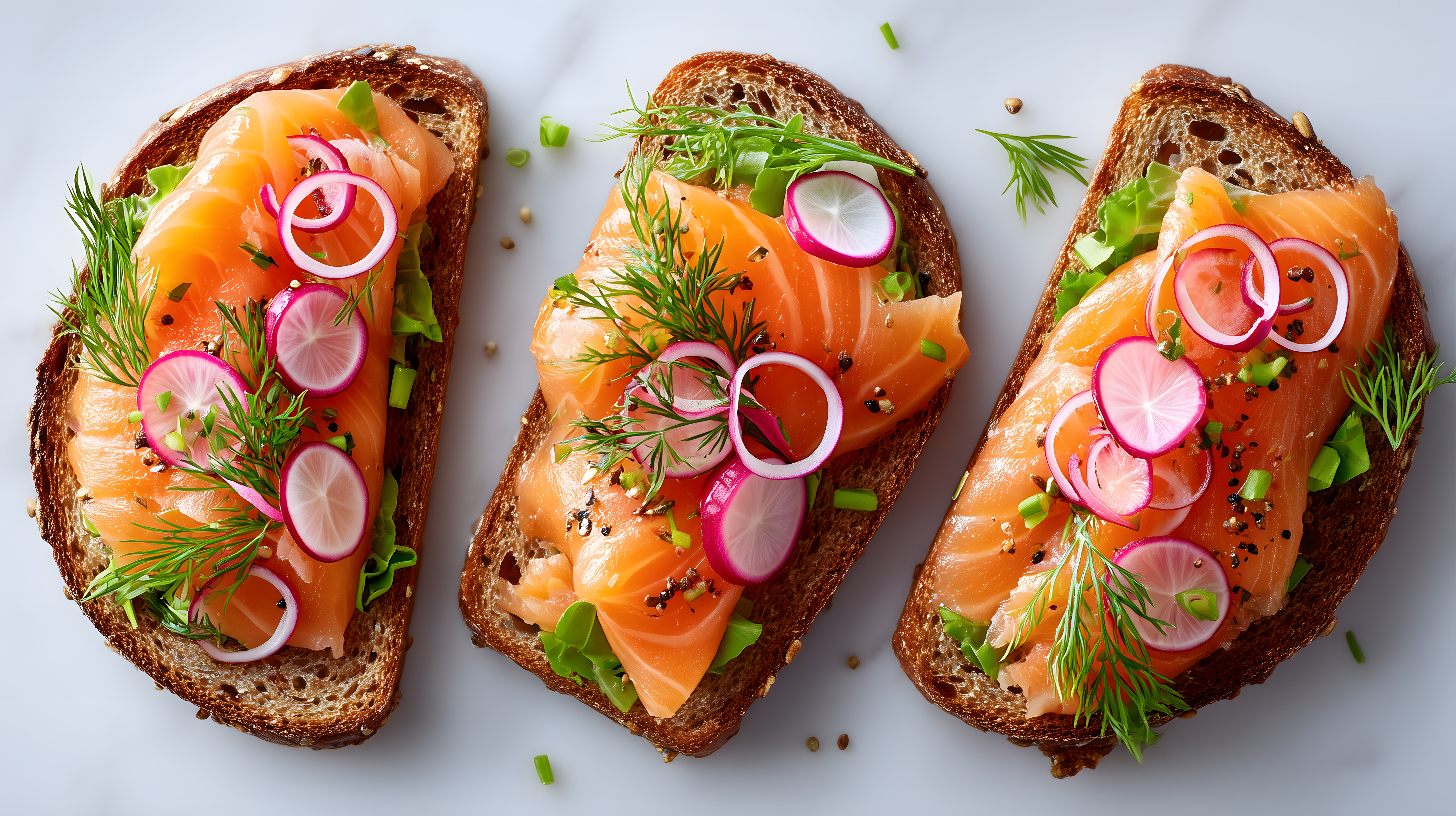 Dieses köstliche Fotomotiv zeigt drei appetitlich angerichtete Lachs-Sandwiches auf einer marmorierter Tischplatte. Die Sandwiches sind mit frischen, knackigen Radieschen, aromatischem Dill und weiteren Gewürzen dekoriert, was eine optisch ansprechende und geschmackvolle Präsentation ergibt. Das Bild vermittelt einen natürlichen, rustikalen Charme und eignet sich hervorragend für den Einsatz in Blogs, Newslettern oder Werbematerialien rund um gesunde, leckere Ernährung. Als hochwertiges Stockfoto in hoher Auflösung und unter einer Creative-Commons-Lizenz ist es vielfältig einsetzbar.