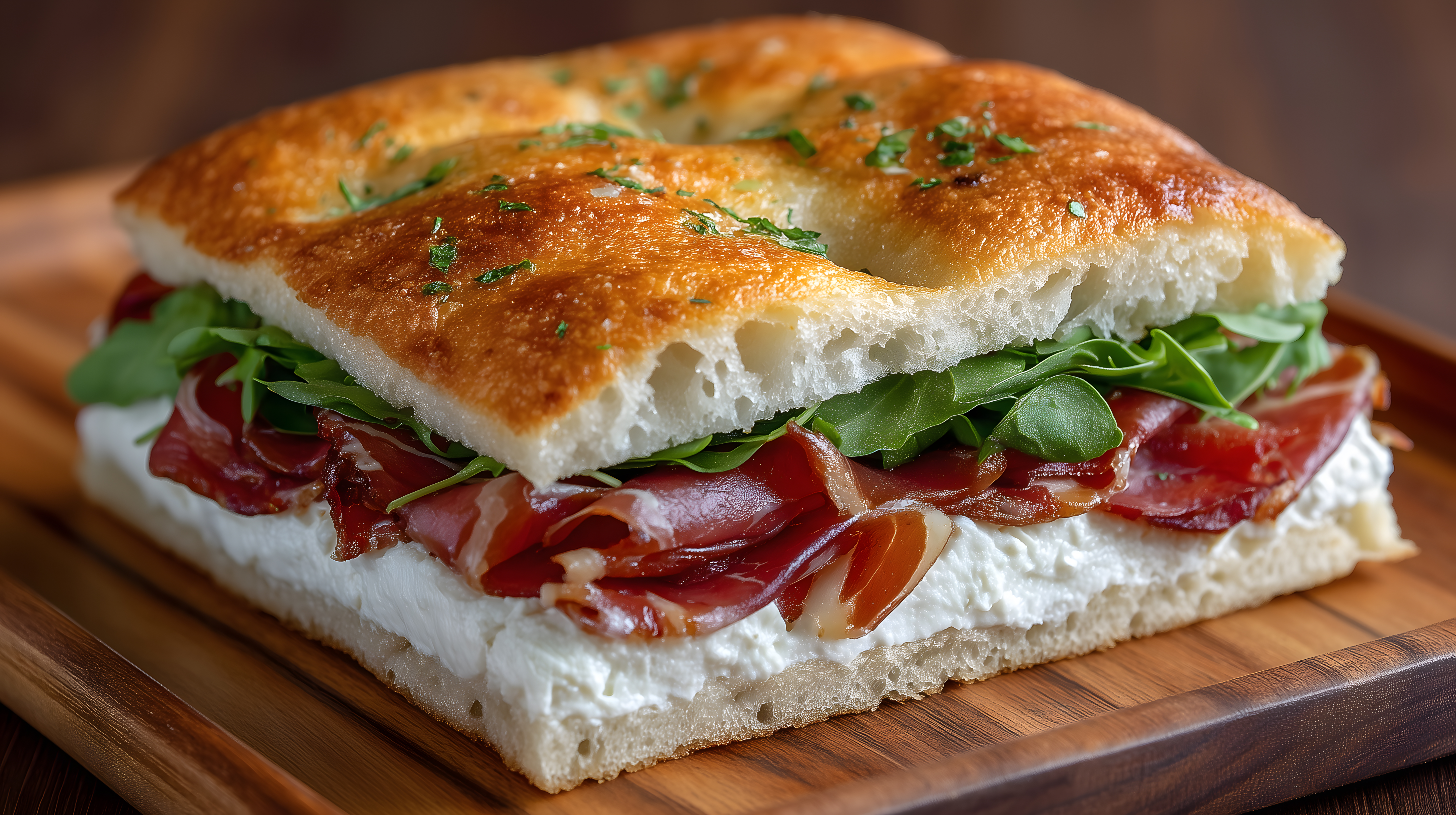 Dieses köstliche Focaccia-Sandwich ist ein Hingucker für jeden Food-Blog oder Social-Media-Kanal. Die knusprige, mit Kräutern bestreute Oberfläche der Brotscheibe bildet einen reizvollen Kontrast zu den frischen, grünen Rucola-Blättern und den würzigen Schinkenscheiben. Das rustikale Holzbrett als Servierunterlage verleiht dem Bild eine authentische, natürliche Note. Dieses hochwertige Stockfoto in hoher Auflösung kann kostenlos unter der Creative-Commons-Lizenz verwendet werden - perfekt für Ihre Kulinarik-Themen in Newsletter, Werbung oder Onlineauftritt.