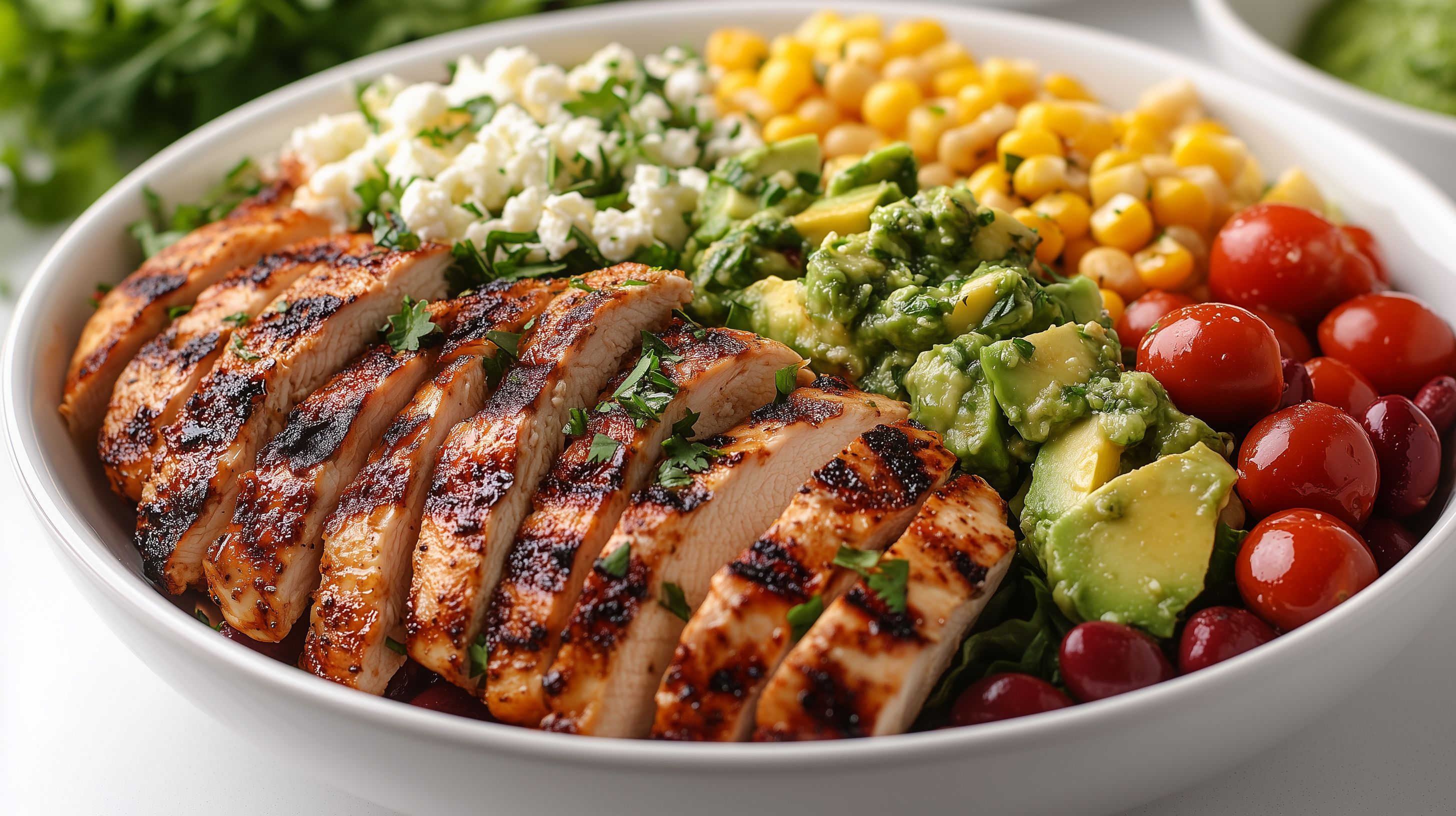 Dieses Foto zeigt ein frisch zubereitetes, leckeres Hühnchen-Avocado-Salat-Gericht in einer rustikalen, weißen Schüssel. Das Gericht besteht aus gegrillten, gewürzten Hähnchenbruststreifen, frischen Tomaten, Mais, Avocadostücken und einer bunten Salatmischung. Die Zutaten sind ansprechend angeordnet und die Farben erzeugen einen appetitlichen Gesamteindruck. Dieses Bild eignet sich hervorragend als kostenloses Stockfoto für Blogs, Newsletter, Social-Media-Beiträge oder Werbematerialien rund um gesunde Ernährung, Rezepte oder Lebensmittel. Die Auflösung ist hochwertig und es steht unter einer Creative-Commons-Lizenz zur freien Nutzung zur Verfügung.