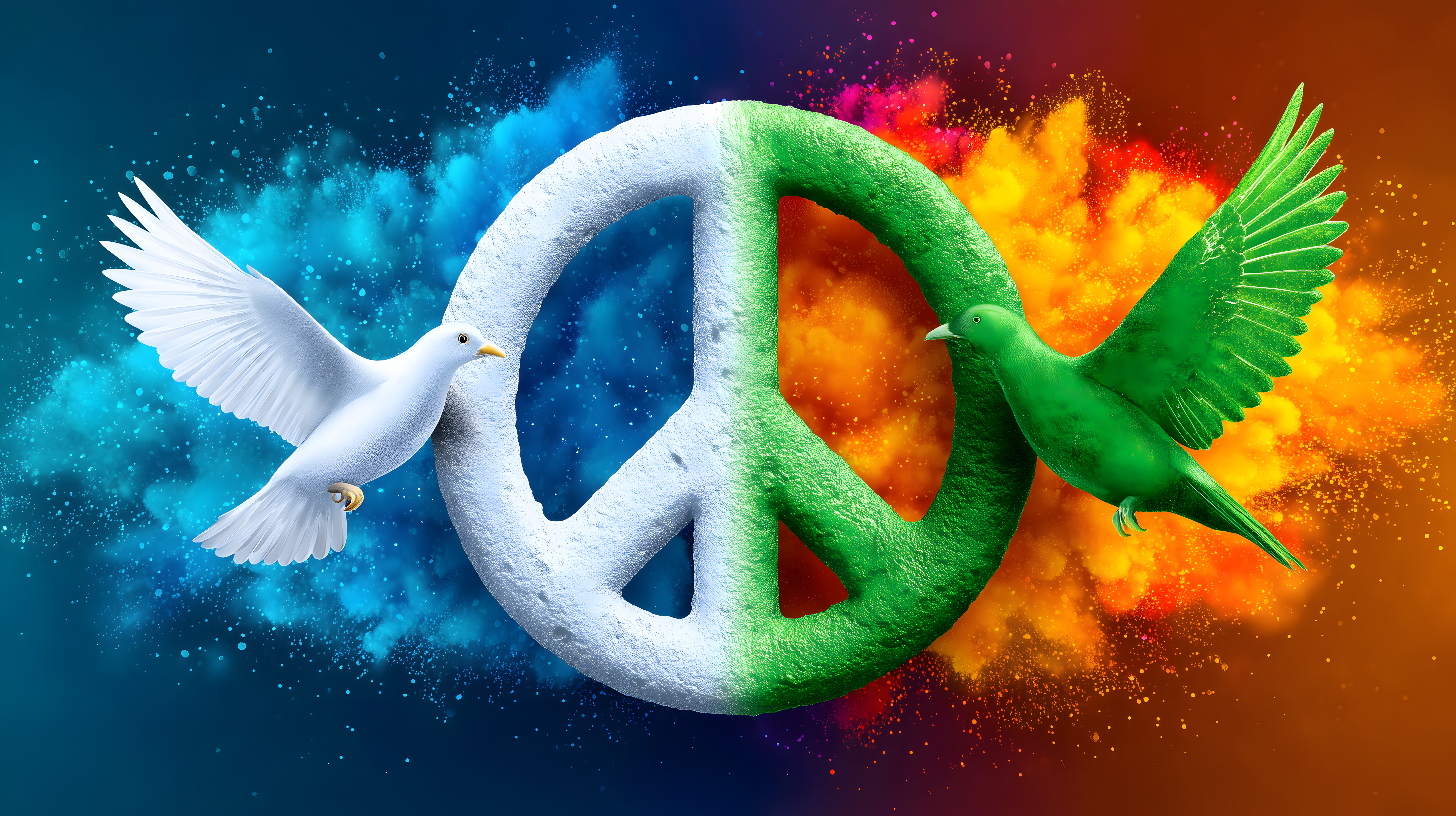Das Bild zeigt ein kreatives, digitales Kunstwerk, das das Symbol des Friedens darstellt. Es besteht aus einem großen, weißen Friedenssymbol, das von einer Explosion bunter Farben umgeben ist. Auf dem Friedenssymbol befinden sich zwei Tauben - eine weiße und eine grüne. Die weißen Tauben stehen traditionell für Frieden, während die grüne Taube eine zusätzliche, positive Komponente hinzufügt. Das Bild strahlt eine einzigartige, lebendige und farbenfrohe Atmosphäre aus, die den Betrachter an Frieden, Hoffnung und Harmonie erinnert.