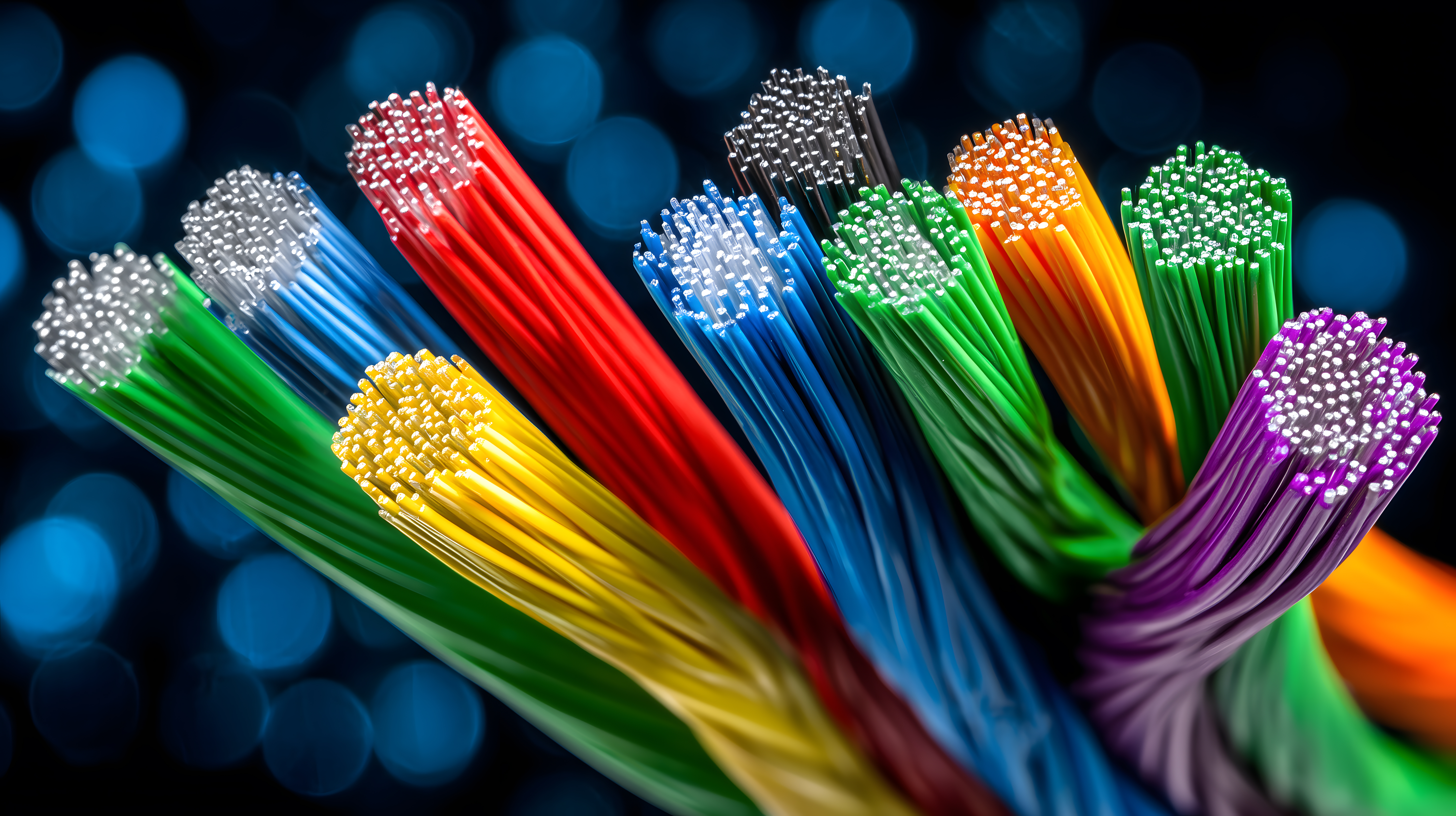 Dieses faszinierende Foto zeigt ein dichtes Bündel bunter Glasfaserkabel in Nahaufnahme. Die Kabel strahlen in leuchtenden Regenbogenfarben wie Rot, Blau, Grün, Gelb und Violett und verleihen dem Bild eine abstrakte, grafische Optik. Die Schärfe und Detailtiefe der Aufnahme lassen die feine Textur und Struktur der Fasern deutlich hervortreten. Dieses Stockfoto eignet sich hervorragend für den Einsatz in Grafikdesign, Webdesign, Präsentationen oder anderen kreativen Projekten, die eine farbenfrohe, technische Ästhetik erfordern. Die hohe Auflösung und Creative-Commons-Lizenz des Bildes machen es zu einem kostenlosen und vielseitig verwendbaren Gestaltungselement.