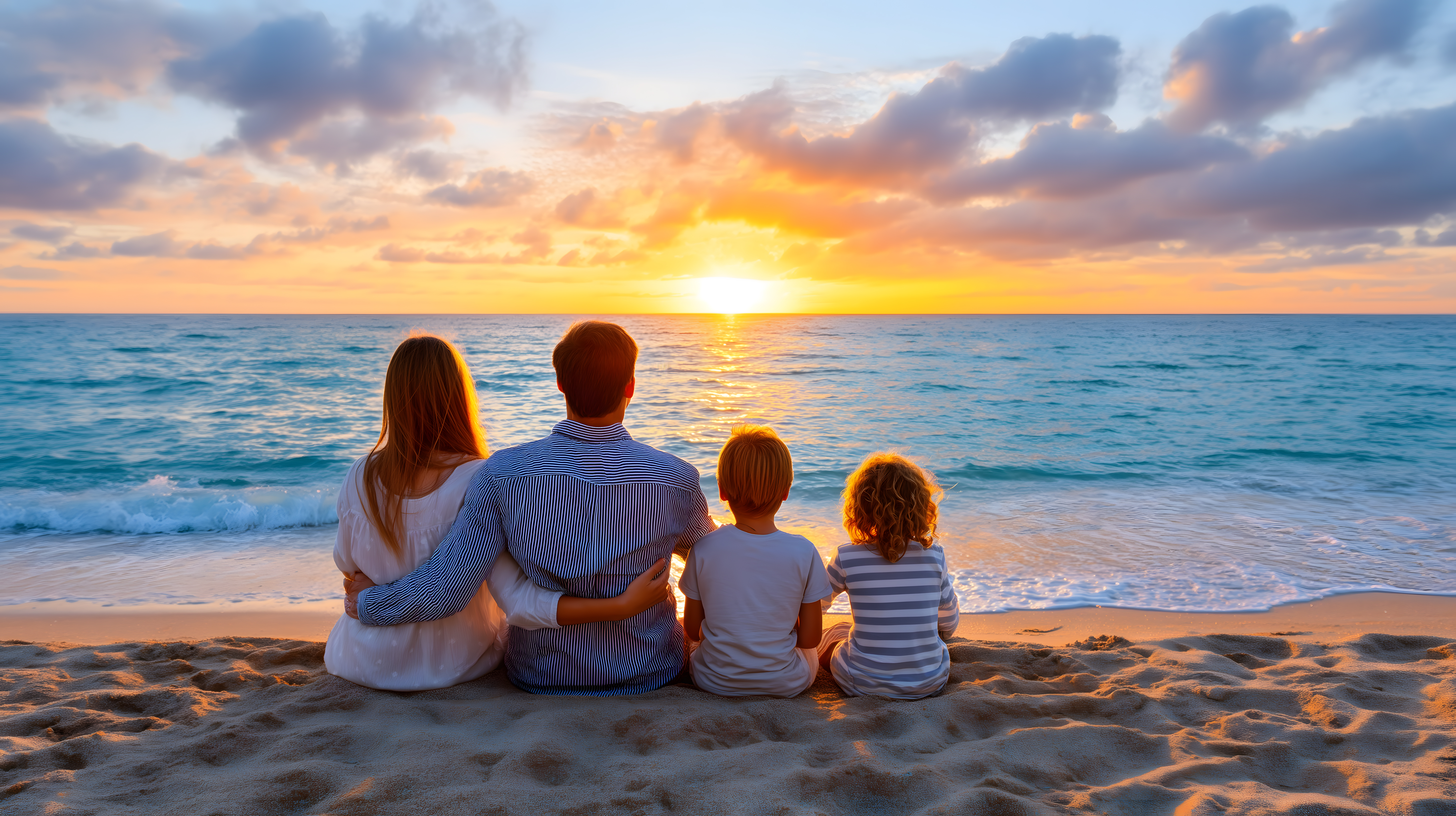 Das Bild zeigt eine vierköpfige Familie, die den Sonnenuntergang am Strand genießt. Die Eltern und zwei Kinder sitzen gemeinsam im Sand und blicken auf das ruhige, türkisfarbene Meer. Der Himmel ist in einem malerischen Farbspiel aus Orange, Rot und Lila getaucht, während die Sonne langsam am Horizont verschwindet. Das Foto strahlt eine friedliche, entspannte Atmosphäre aus und eignet sich hervorragend als kostenloses Stockfoto für Blogs, Social-Media-Kanäle oder Werbematerialien rund um die Themen Urlaub, Reisen, Familie und Natur. Die hochauflösende Datei ist unter der Creative-Commons-Lizenz frei nutzbar.