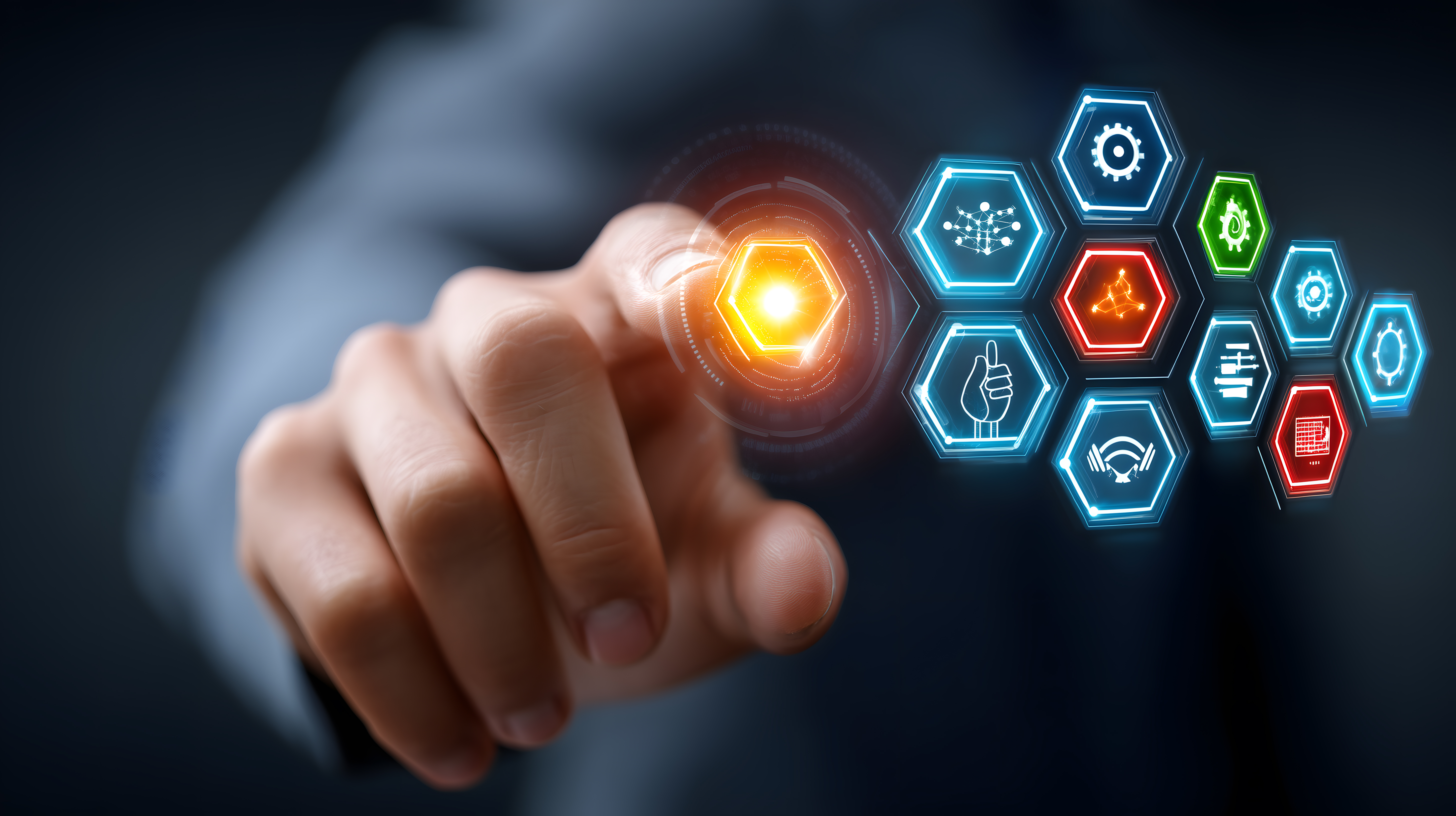 Das Bild zeigt einen Geschäftsmann, der mit futuristischen digitalen Hologrammen interagiert. Verschiedene Symbole und Elemente in leuchtenden Farben schweben um seine Hand, die einen virtuellen Schalter berührt. Die Szene vermittelt den Eindruck von Innovation, Technologie und strategischem Denken in einem digitalen Geschäftsumfeld. Dieses hochwertige Stockfoto eignet sich hervorragend für Blogbeiträge, Newslettergestaltung, Social-Media-Posts und Werbematerialien zum Thema Digitalisierung, Zukunftstechnologie und unternehmerische Kreativität. Das Bild ist in hoher Auflösung und unter einer Creative-Commons-Lizenz frei verfügbar.