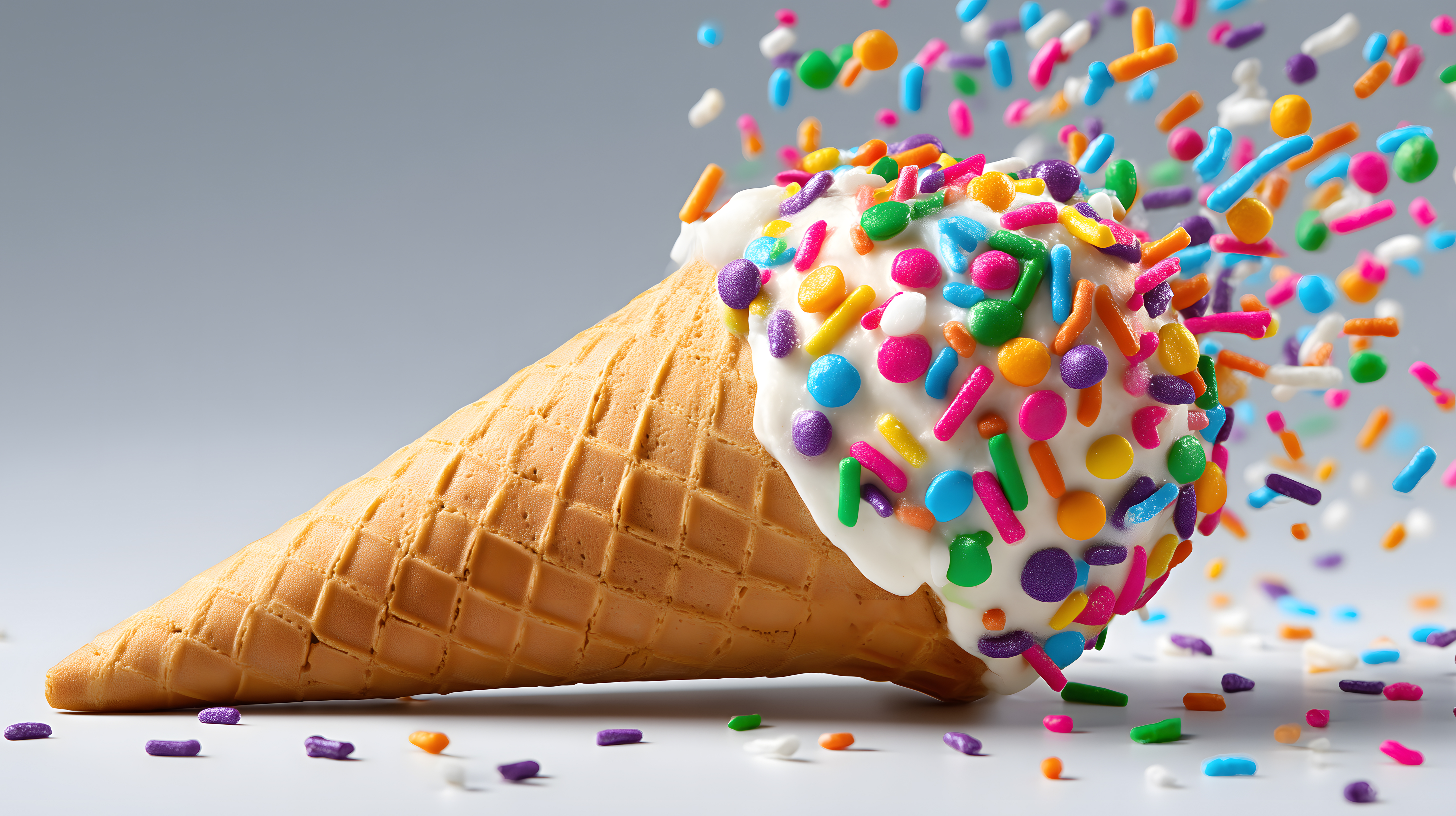 Dieses farbenfrohe Foto zeigt eine kreativ dekorierte Eiswaffel vor einem schlichten, grauen Hintergrund. Die Waffel ist mit einer Creme-Glasur überzogen und mit einem bunten Feuerwerk an Streuseln verziert - von Sprenkeln in Regenbogenfarben bis hin zu länglichen Zuckerstäbchen. Die Komposition und Perspektive lenken den Blick direkt auf das leckere Dessert, das einlädt, genascht zu werden. Dieses freiberuflich lizenzierte Foto eignet sich hervorragend für Werbung, Lifestyle-Beiträge in sozialen Medien oder als ansprechendes Titelbild für Blogbeiträge rund um süße Genüsse und Kreativität in der Lebensmittelfotografie. Als hochauflösendes Stockfoto unter Creative-Commons-Lizenz steht es kostenlos zur Verfügung.